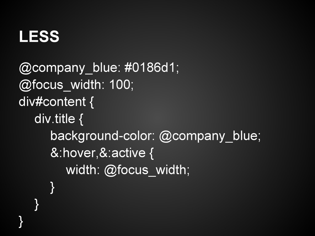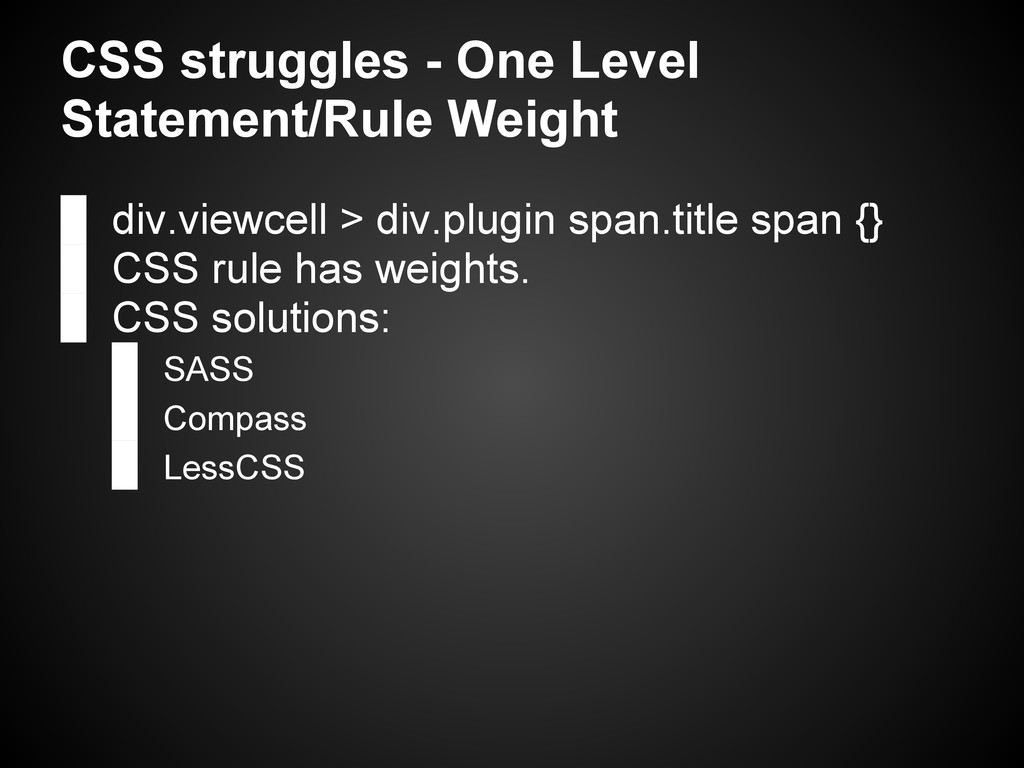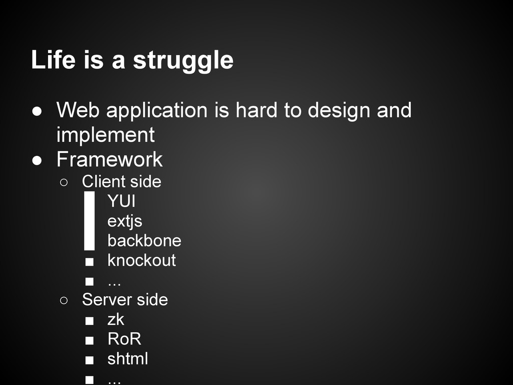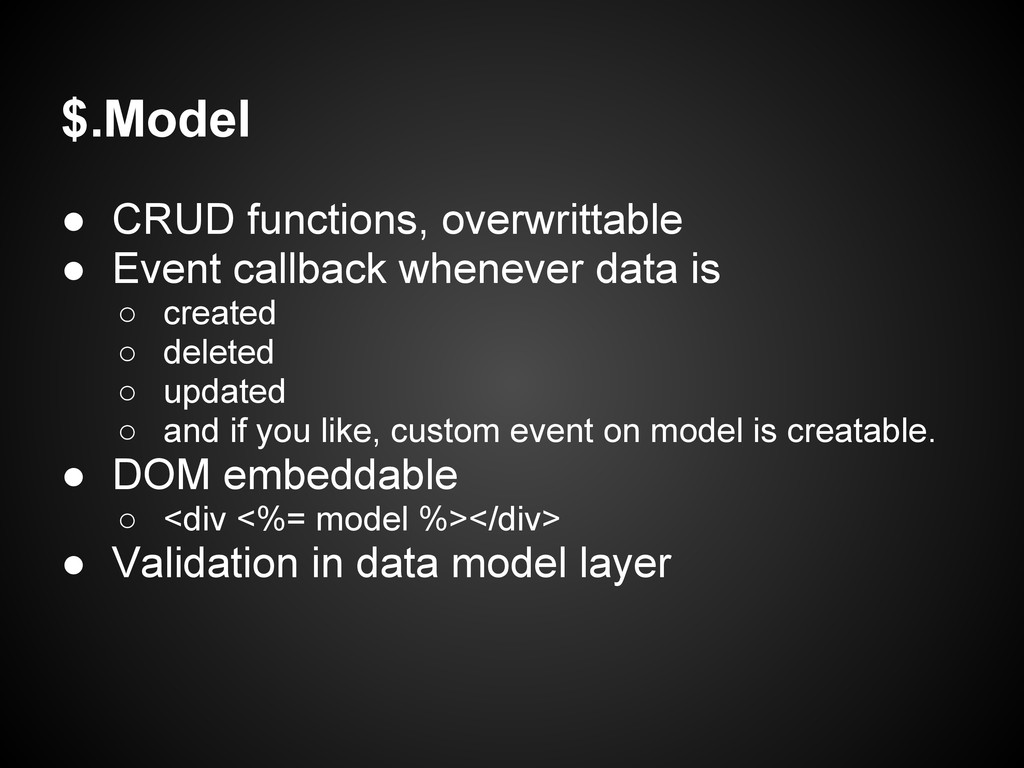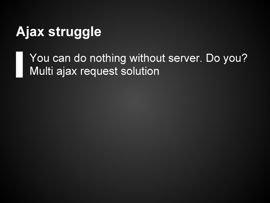 something like requireJS. ◦ By concurrent ajax request. ◦ steal('jquery').then ('jquery/ui','jquery/event/mousewheel').then('./lol.css', function(){ //.... }); • Code generator ◦ ./js jquery/templates/controller A.B.C • Compile scripts • (Customizable) build process