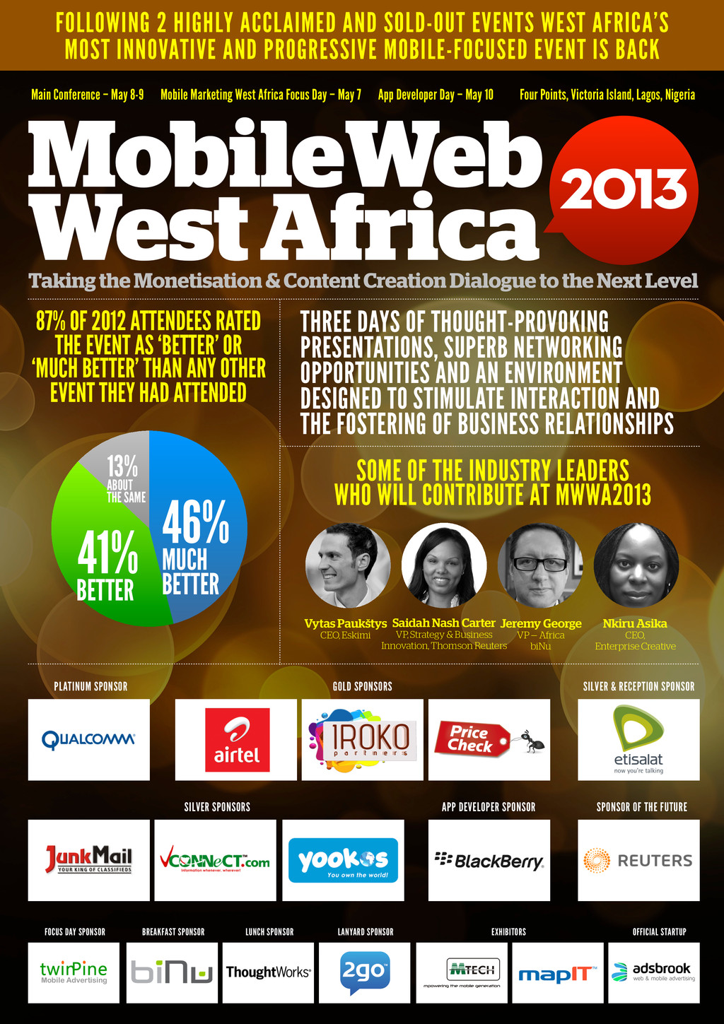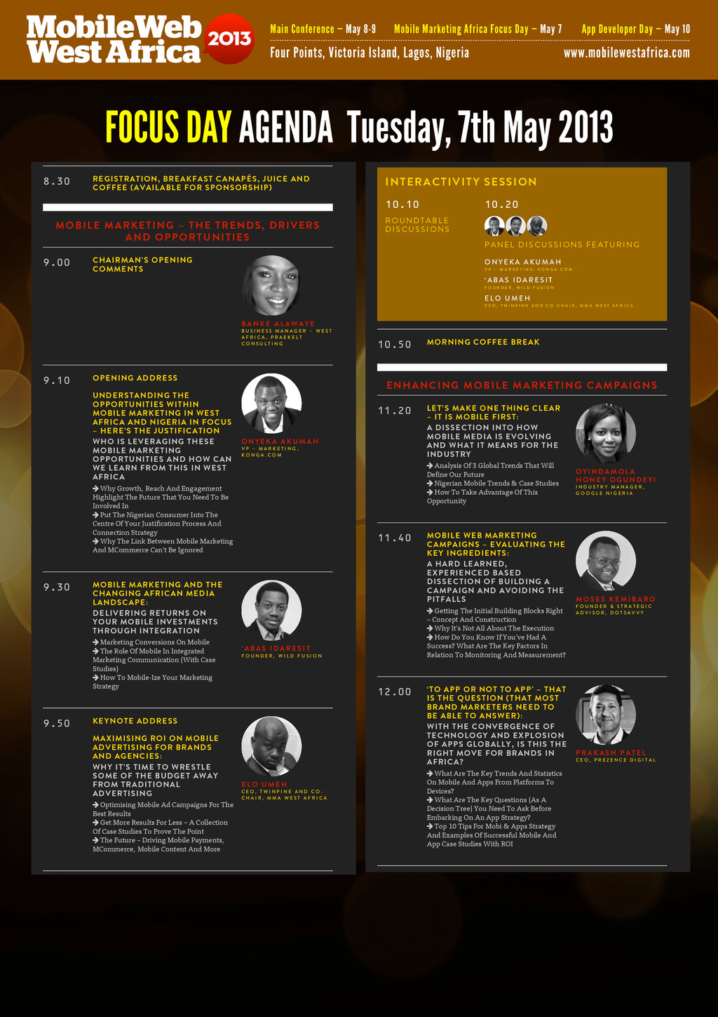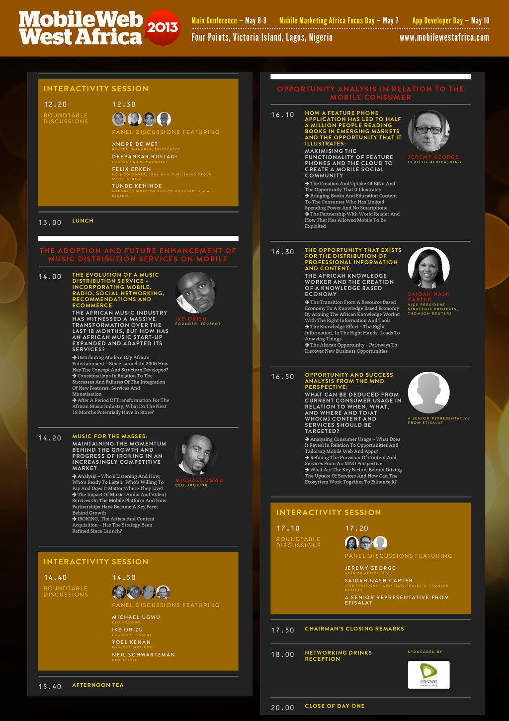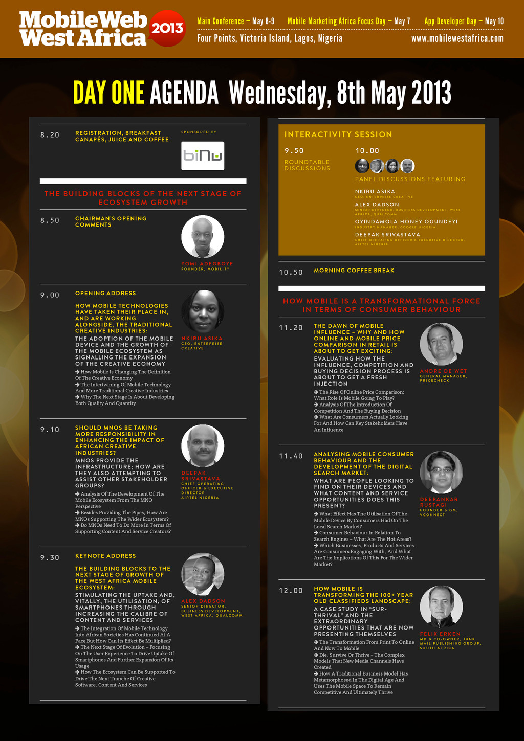— May 7 App Developer Day — May 10 Four Points, Victoria Island, Lagos, Nigeria www.mobilewestafrica.com MW W A 20 1 3 MAIN CONFERENCE DAY 1 — WEDNESDAY 8TH MAY 2013 8.20 REGISTRATION, BREAKFAST CANAPÉS, JUICE AND COFFEE S P O N S O R E D B Y THE BUILDING BLOCKS OF THE NEXT STAGE OF ECOSYSTEM GROWTH 8.50 CHAIRMAN’S OPENING COMMENTS YOM I A D E G B OYE F O U N D E R , M O B I L I T Y 9.00 OPENING ADDRESS HOW MOBILE TECHNOLOGIES HAVE TAKEN THEIR PLACE IN, AND ARE WORKING ALONGSIDE, THE TRADITIONAL CREATIVE INDUSTRIES: THE ADOPTION OF THE MOBILE DEVICE AND THE GROWTH OF THE MOBILE ECOSYSTEM AS SIGNALLING THE EXPANSION OF THE CREATIVE ECONOMY How Mobile Is Changing The Definition Of The Creative Economy The Intertwining Of Mobile Technology And More Traditional Creative Industries Why The Next Stage Is About Developing Both Quality And Quantity N K I R U A S I K A C E O , E N T E R P R I S E C R E A T I V E 9.10 SHOULD MNOS BE TAKING MORE RESPONSIBILITY IN ENHANCING THE IMPACT OF AFRICAN CREATIVE INDUSTRIES? MNOS PROVIDE THE INFRASTRUCTURE; HOW ARE THEY ALSO ATTEMPTING TO ASSIST OTHER STAKEHOLDER GROUPS? Analysis Of The Development Of The Mobile Ecosystem From The MNO Perspective Besides Providing The Pipes, How Are MNOs Supporting The Wider Ecosystem? Do MNOs Need To Do More In Terms Of Supporting Content And Service Creators? D E E P A K S R I V A S T A V A C H I E F O P E R A T I N G O F F I C E R & E X E C U T I V E D I R E C T O R A I R T E L N I G E R I A 9.30 KEYNOTE ADDRESS THE BUILDING BLOCKS TO THE NEXT STAGE OF GROWTH OF THE WEST AFRICA MOBILE ECOSYSTEM: STIMULATING THE UPTAKE AND, VITALLY, THE UTILISATION, OF SMARTPHONES THROUGH INCREASING THE CALIBRE OF CONTENT AND SERVICES The Integration Of Mobile Technology Into African Societies Has Continued At A Pace But How Can Its Effect Be Multiplied? The Next Stage Of Evolution – Focusing On The User Experience To Drive Uptake Of Smartphones And Further Expansion Of Its Usage How The Ecosystem Can Be Supported To Drive The Next Tranche Of Creative Software, Content And Services A L E X D A D S ON S E N I O R D I R E C T O R , B U S I N E S S D E V E L O P M E N T , W E S T A F R I C A , Q U A L C O M M INTERACTIVITY SESSION 9.50 10.00 DAY ONE AGENDA Wednesday, 8th May 2013 THE WEST AFRICA MOBILE ECOSYSTEM: STIMULATING THE UPTAKE AND, VITALLY, THE UTILISATION, OF SMARTPHONES THROUGH INCREASING THE CALIBRE OF CONTENT AND SERVICES The Integration Of Mobile Technology Into African Societies Has Continued At A Pace But How Can Its Effect Be Multiplied? The Next Stage Of Evolution – Focusing On The User Experience To Drive Uptake Of Smartphones And Further Expansion Of Its Usage How The Ecosystem Can Be Supported To Drive The Next Tranche Of Creative Software, Content And Services A L E X D A D S ON S E N I O R D I R E C T O R , B U S I N E S S D E V E L O P M E N T , W E S T A F R I C A , Q U A L C O M M INTERACTIVITY SESSION 9.50 ROUND T AB L E D I S CUS S I ONS 10.00 P ANE L D I S CUS S I ONS FE AT URI NG N KIR U A S IKA C E O , E N T E R P R I S E C R E A T I V E A L E X DA DS O N S E N I O R D I R E C T O R , B U S I N E S S D E V E L O P M E N T , W E S T A F R I C A , Q U A L C O M M O YIN DA M O L A H O N E Y O G U N DE YI I N D U S T R Y M A N A G E R , G O O G L E N I G E R I A DE E P A K S R IV A S T A V A C H I E F O P E R A T I N G O F F I C E R & E X E C U T I V E D I R E C T O R , A I R T E L N I G E R I A 10.50 MORNING COFFEE BREAK HOW MOBILE IS A TRANSFORMATIONAL FORCE IN TERMS OF CONSUMER BEHAVIOUR 11.20 THE DAWN OF MOBILE INFLUENCE – WHY AND HOW ONLINE AND MOBILE PRICE COMPARISON IN RETAIL IS ABOUT TO GET EXCITING: EVALUATING HOW THE INFLUENCE, COMPETITION AND BUYING DECISION PROCESS IS ABOUT TO GET A FRESH INJECTION The Rise Of Online Price Comparison: What Role Is Mobile Going To Play? Analysis Of The Introduction Of Competition And The Buying Decision What Are Consumers Actually Looking For And How Can Key Stakeholders Have An Influence A N D R E D E W E T G E N E R A L M A N A G E R , P R I C E C H E C K 11.40 ANALYSING MOBILE CONSUMER BEHAVIOUR AND THE DEVELOPMENT OF THE DIGITAL SEARCH MARKET: WHAT ARE PEOPLE LOOKING TO FIND ON THEIR DEVICES AND WHAT CONTENT AND SERVICE OPPORTUNITIES DOES THIS PRESENT? What Effect Has The Utilisation Of The Mobile Device By Consumers Had On The Local Search Market? Consumer Behaviour In Relation To Search Engines – What Are The Hot Areas? Which Businesses, Products And Services Are Consumers Engaging With, And What Are The Implications Of This For The Wider Market? D E E P A N K A R R U S T A G I F O U N D E R & G M , V C O N N E C T 12.00 HOW MOBILE IS TRANSFORMING THE 100+ YEAR OLD CLASSIFIEDS LANDSCAPE: A CASE STUDY IN “SUR- THRIVAL” AND THE EXTRAORDINARY OPPORTUNITIES THAT ARE NOW PRESENTING THEMSELVES The Transformation From Print To Online And Now To Mobile Die, Survive Or Thrive – The Complex Models That New Media Channels Have Created How A Traditional Business Model Has Metamorphosed In The Digital Age And Uses The Mobile Space To Remain Competitive And Ultimately Thrive F E L I X E R K E N M D & C O - O W N E R , J U N K M A I L P U B L I S H I N G G R O U P , S O U T H A F R I C A INTERACTIVITY SESSION