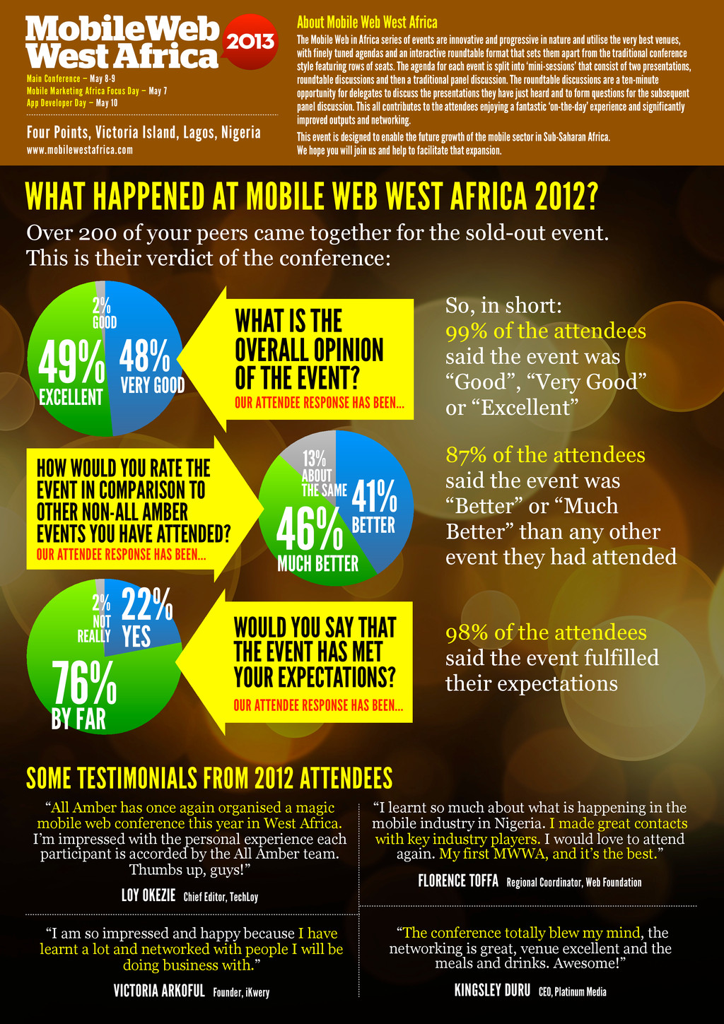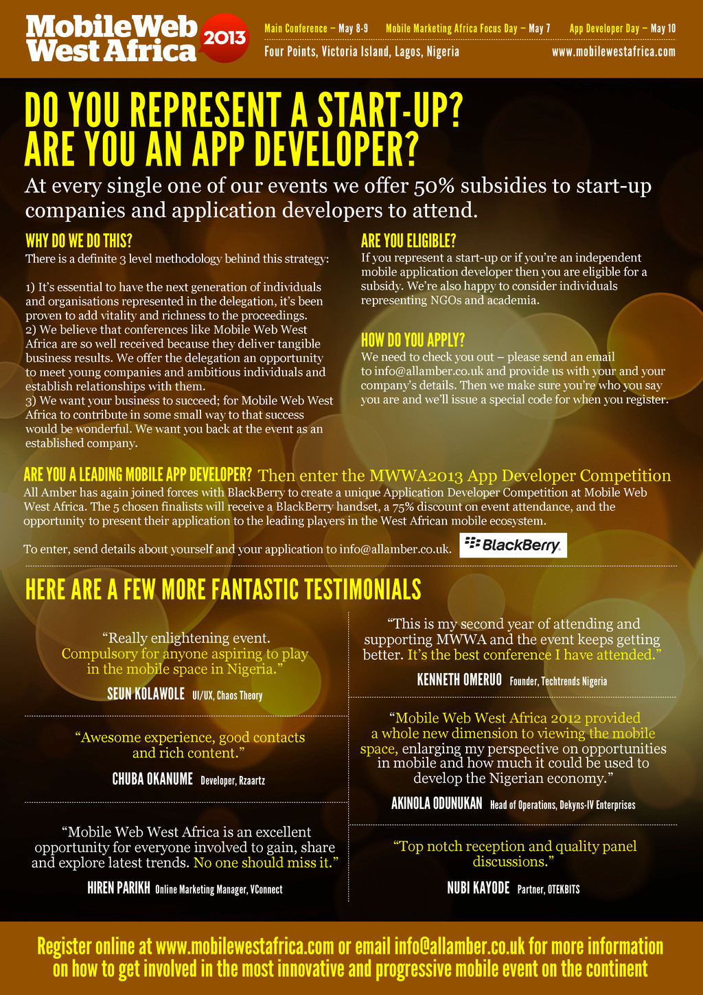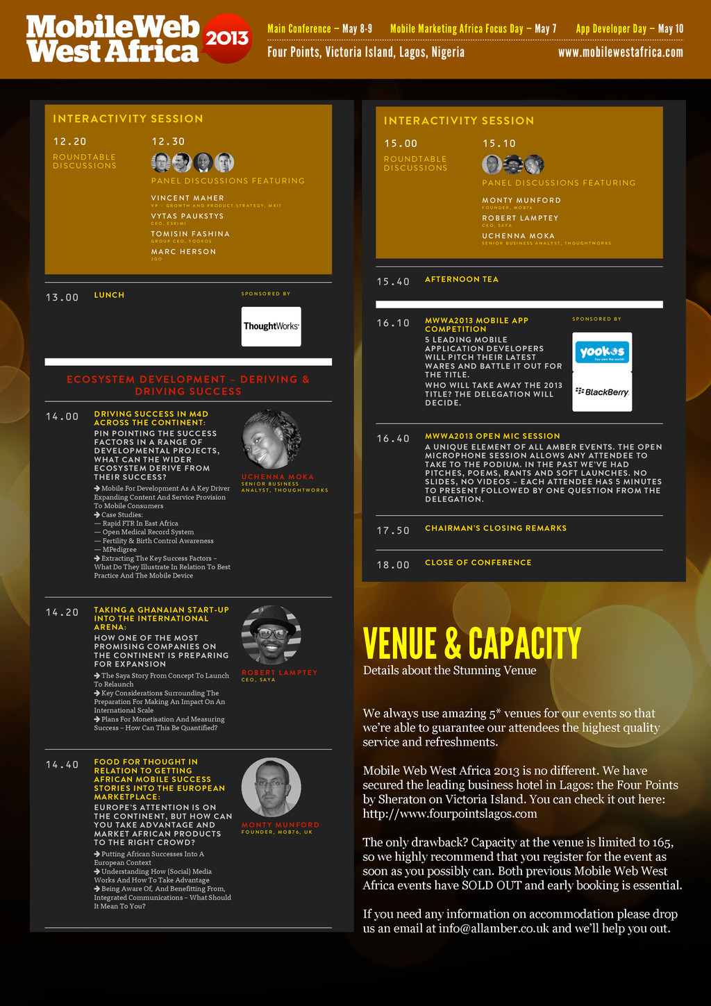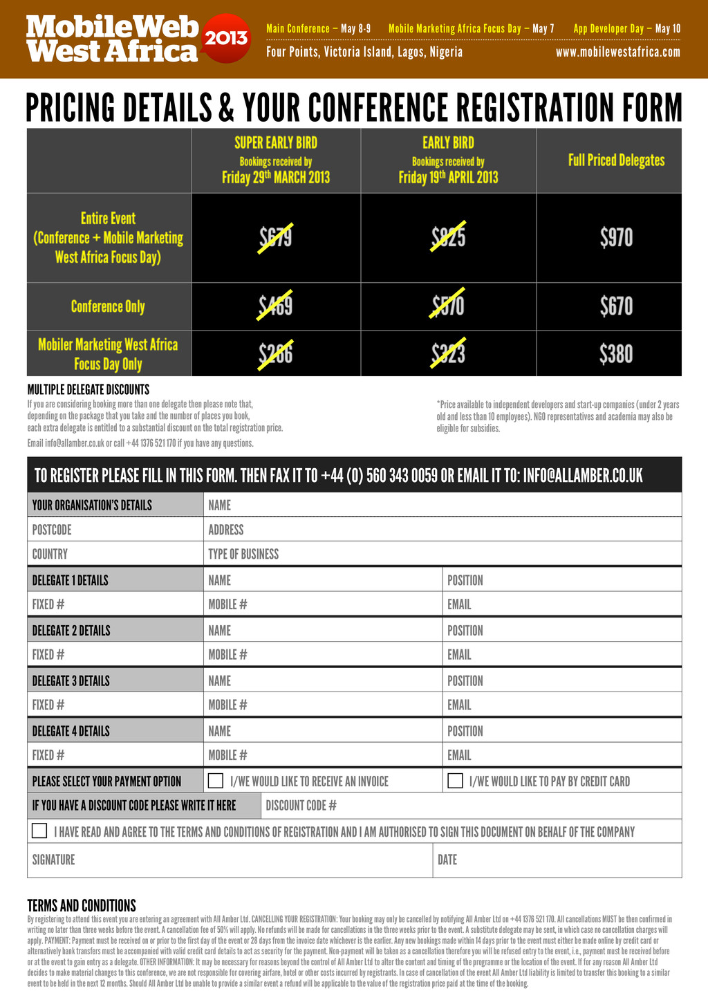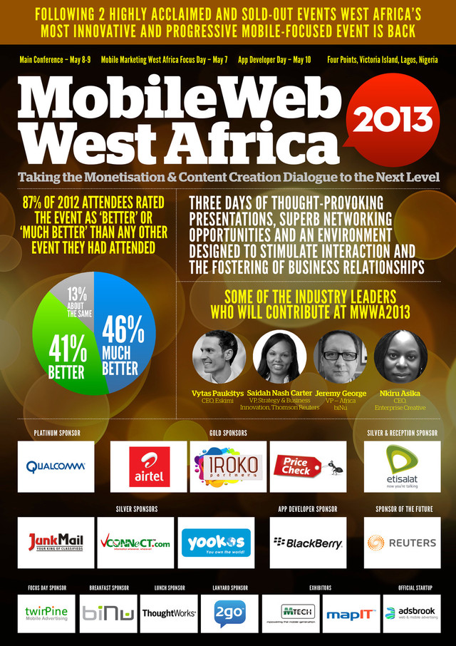 — May 7 App Developer Day — May 10 Four Points, Victoria Island, Lagos, Nigeria www.mobilewestafrica.com MW W A 20 1 3 MAIN CONFERENCE DAY 1 — WEDNESDAY 8TH MAY 2013 8.20 REGISTRATION, BREAKFAST CANAPÉS, JUICE AND COFFEE S P O N S O R E D B Y THE BUILDING BLOCKS OF THE NEXT STAGE OF ECOSYSTEM GROWTH 8.50 CHAIRMAN’S OPENING COMMENTS YOM I A D E G B OYE F O U N D E R , M O B I L I T Y 9.00 OPENING ADDRESS HOW MOBILE TECHNOLOGIES HAVE TAKEN THEIR PLACE IN, AND ARE WORKING ALONGSIDE, THE TRADITIONAL CREATIVE INDUSTRIES: THE ADOPTION OF THE MOBILE DEVICE AND THE GROWTH OF THE MOBILE ECOSYSTEM AS SIGNALLING THE EXPANSION OF THE CREATIVE ECONOMY How Mobile Is Changing The Definition Of The Creative Economy The Intertwining Of Mobile Technology And More Traditional Creative Industries Why The Next Stage Is About Developing Both Quality And Quantity N K I R U A S I K A C E O , E N T E R P R I S E C R E A T I V E 9.10 SHOULD MNOS BE TAKING MORE RESPONSIBILITY IN ENHANCING THE IMPACT OF AFRICAN CREATIVE INDUSTRIES? MNOS PROVIDE THE INFRASTRUCTURE; HOW ARE THEY ALSO ATTEMPTING TO ASSIST OTHER STAKEHOLDER GROUPS? Analysis Of The Development Of The Mobile Ecosystem From The MNO Perspective Besides Providing The Pipes, How Are MNOs Supporting The Wider Ecosystem? Do MNOs Need To Do More In Terms Of Supporting Content And Service Creators? D E E P A K S R I V A S T A V A C H I E F O P E R A T I N G O F F I C E R & E X E C U T I V E D I R E C T O R A I R T E L N I G E R I A 9.30 KEYNOTE ADDRESS THE BUILDING BLOCKS TO THE NEXT STAGE OF GROWTH OF THE WEST AFRICA MOBILE ECOSYSTEM: STIMULATING THE UPTAKE AND, VITALLY, THE UTILISATION, OF SMARTPHONES THROUGH INCREASING THE CALIBRE OF CONTENT AND SERVICES The Integration Of Mobile Technology Into African Societies Has Continued At A Pace But How Can Its Effect Be Multiplied? The Next Stage Of Evolution – Focusing On The User Experience To Drive Uptake Of Smartphones And Further Expansion Of Its Usage How The Ecosystem Can Be Supported To Drive The Next Tranche Of Creative Software, Content And Services A L E X D A D S ON S E N I O R D I R E C T O R , B U S I N E S S D E V E L O P M E N T , W E S T A F R I C A , Q U A L C O M M INTERACTIVITY SESSION 9.50 10.00 DAY ONE AGENDA Wednesday, 8th May 2013 THE WEST AFRICA MOBILE ECOSYSTEM: STIMULATING THE UPTAKE AND, VITALLY, THE UTILISATION, OF SMARTPHONES THROUGH INCREASING THE CALIBRE OF CONTENT AND SERVICES The Integration Of Mobile Technology Into African Societies Has Continued At A Pace But How Can Its Effect Be Multiplied? The Next Stage Of Evolution – Focusing On The User Experience To Drive Uptake Of Smartphones And Further Expansion Of Its Usage How The Ecosystem Can Be Supported To Drive The Next Tranche Of Creative Software, Content And Services A L E X D A D S ON S E N I O R D I R E C T O R , B U S I N E S S D E V E L O P M E N T , W E S T A F R I C A , Q U A L C O M M INTERACTIVITY SESSION 9.50 ROUND T AB L E D I S CUS S I ONS 10.00 P ANE L D I S CUS S I ONS FE AT URI NG N KIR U A S IKA C E O , E N T E R P R I S E C R E A T I V E A L E X DA DS O N S E N I O R D I R E C T O R , B U S I N E S S D E V E L O P M E N T , W E S T A F R I C A , Q U A L C O M M O YIN DA M O L A H O N E Y O G U N DE YI I N D U S T R Y M A N A G E R , G O O G L E N I G E R I A DE E P A K S R IV A S T A V A C H I E F O P E R A T I N G O F F I C E R & E X E C U T I V E D I R E C T O R , A I R T E L N I G E R I A 10.50 MORNING COFFEE BREAK HOW MOBILE IS A TRANSFORMATIONAL FORCE IN TERMS OF CONSUMER BEHAVIOUR 11.20 THE DAWN OF MOBILE INFLUENCE – WHY AND HOW ONLINE AND MOBILE PRICE COMPARISON IN RETAIL IS ABOUT TO GET EXCITING: EVALUATING HOW THE INFLUENCE, COMPETITION AND BUYING DECISION PROCESS IS ABOUT TO GET A FRESH INJECTION The Rise Of Online Price Comparison: What Role Is Mobile Going To Play? Analysis Of The Introduction Of Competition And The Buying Decision What Are Consumers Actually Looking For And How Can Key Stakeholders Have An Influence A N D R E D E W E T G E N E R A L M A N A G E R , P R I C E C H E C K 11.40 ANALYSING MOBILE CONSUMER BEHAVIOUR AND THE DEVELOPMENT OF THE DIGITAL SEARCH MARKET: WHAT ARE PEOPLE LOOKING TO FIND ON THEIR DEVICES AND WHAT CONTENT AND SERVICE OPPORTUNITIES DOES THIS PRESENT? What Effect Has The Utilisation Of The Mobile Device By Consumers Had On The Local Search Market? Consumer Behaviour In Relation To Search Engines – What Are The Hot Areas? Which Businesses, Products And Services Are Consumers Engaging With, And What Are The Implications Of This For The Wider Market? D E E P A N K A R R U S T A G I F O U N D E R & G M , V C O N N E C T 12.00 HOW MOBILE IS TRANSFORMING THE 100+ YEAR OLD CLASSIFIEDS LANDSCAPE: A CASE STUDY IN “SUR- THRIVAL” AND THE EXTRAORDINARY OPPORTUNITIES THAT ARE NOW PRESENTING THEMSELVES The Transformation From Print To Online And Now To Mobile Die, Survive Or Thrive – The Complex Models That New Media Channels Have Created How A Traditional Business Model Has Metamorphosed In The Digital Age And Uses The Mobile Space To Remain Competitive And Ultimately Thrive F E L I X E R K E N M D & C O - O W N E R , J U N K M A I L P U B L I S H I N G G R O U P , S O U T H A F R I C A INTERACTIVITY SESSION