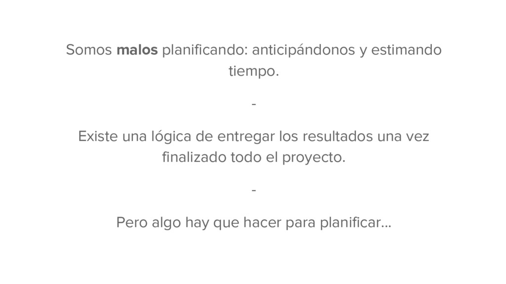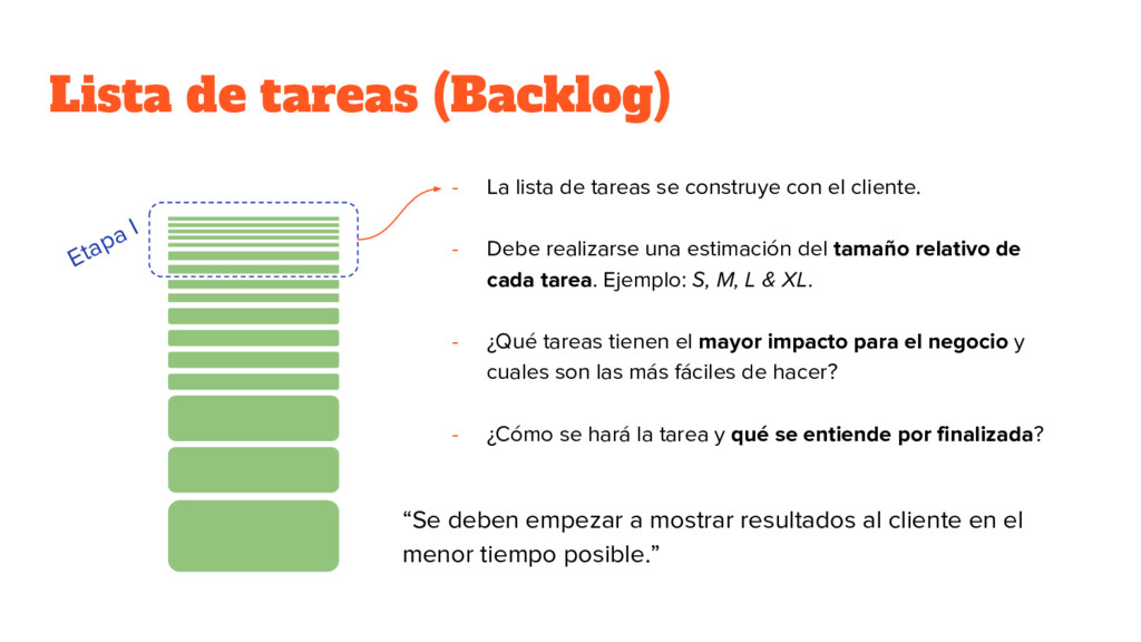construye con el cliente. - Debe realizarse una estimación del tamaño relativo de cada tarea. Ejemplo: S, M, L & XL. - ¿Qué tareas tienen el mayor impacto para el negocio y cuales son las más fáciles de hacer? - ¿Cómo se hará la tarea y qué se entiende por finalizada? “Se deben empezar a mostrar resultados al cliente en el menor tiempo posible.” Etapa I