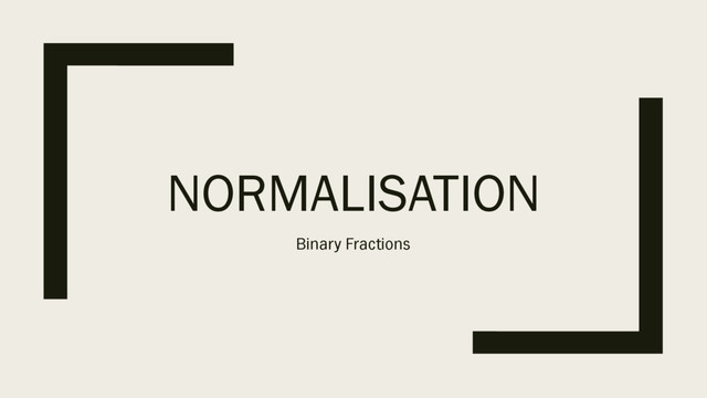 ▪ All negative numbers must start 1.0 ▪ In doing so, we increase the accuracy we are able to achieve by utilising the positions after the decimal point. ▪ Take the following positive number from the previous slide: 0.001 0100 ▪ Move the point before the one and count the shifts ▪ Minus these shifts from the original exponent, with a four bit mantissa this leaves 0.100 0010 ▪ This is now the normalised version of the floating point number 2.0