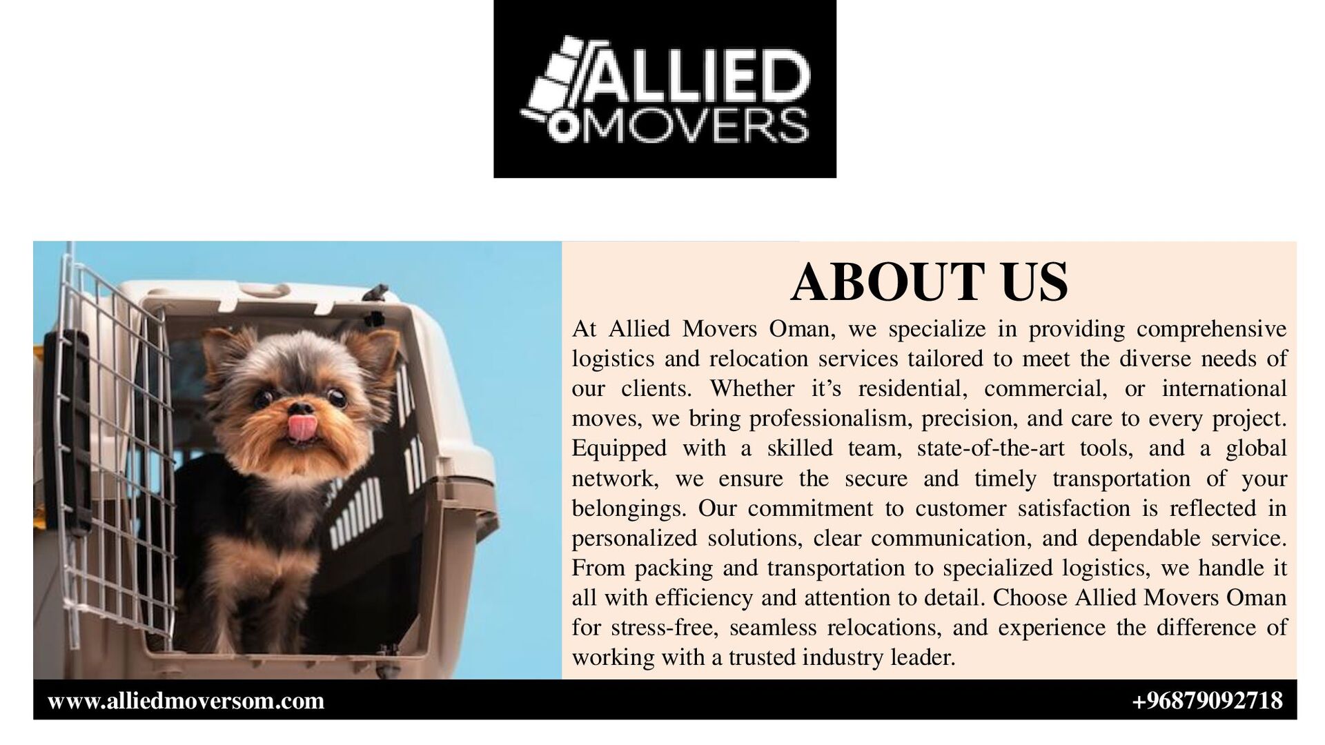 in providing comprehensive logistics and relocation services tailored to meet the diverse needs of our clients. Whether it’s residential, commercial, or international moves, we bring professionalism, precision, and care to every project. Equipped with a skilled team, state-of-the-art tools, and a global network, we ensure the secure and timely transportation of your belongings. Our commitment to customer satisfaction is reflected in personalized solutions, clear communication, and dependable service. From packing and transportation to specialized logistics, we handle it all with efficiency and attention to detail. Choose Allied Movers Oman for stress-free, seamless relocations, and experience the difference of working with a trusted industry leader.