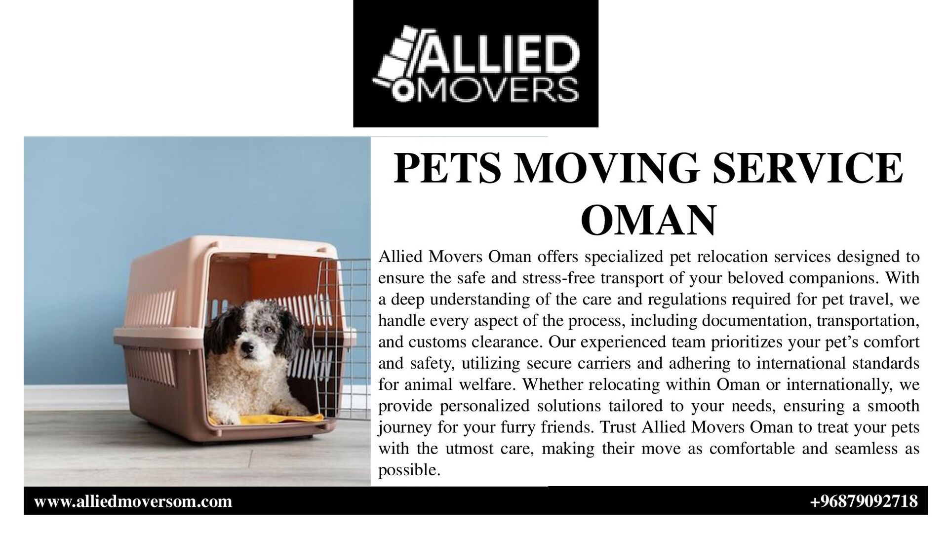 specialized pet relocation services designed to ensure the safe and stress-free transport of your beloved companions. With a deep understanding of the care and regulations required for pet travel, we handle every aspect of the process, including documentation, transportation, and customs clearance. Our experienced team prioritizes your pet’s comfort and safety, utilizing secure carriers and adhering to international standards for animal welfare. Whether relocating within Oman or internationally, we provide personalized solutions tailored to your needs, ensuring a smooth journey for your furry friends. Trust Allied Movers Oman to treat your pets with the utmost care, making their move as comfortable and seamless as possible.
