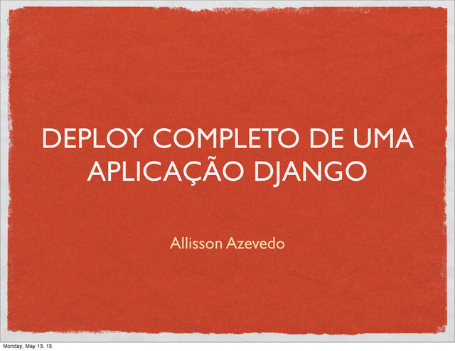 redirecionar as requisições para o gunicorn Gunicorn como servidor de aplicação Supervisor para gerenciar os processos do gunicorn Postgresql como banco de dados Sentry para gerenciar possíveis erros em produção Monday, May 13, 13