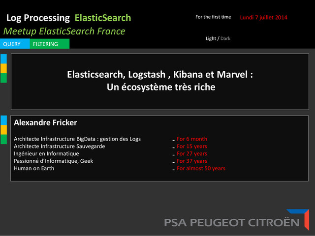 juillet 2014 For the first time Alexandre Fricker Architecte Infrastructure BigData : gestion des Logs … For 6 month Architecte Infrastructure Sauvegarde … For 15 years Ingénieur en Informatique … For 27 years Passionné d’Informatique, Geek … For 37 years Human on Earth … For almost 50 years Light / Dark Elasticsearch, Logstash , Kibana et Marvel : Un écosystème très riche