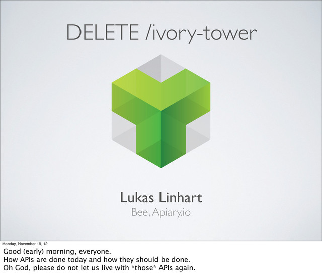 Welcome to our API. Comments support Markdown syntax --- -- Retrieve Tweets -- GET /tweets > Accept: application/json < 200 < Content-Type: application/json { "items": [ { "url": "/feed", "range":"2ZY48XPZ", "quantity": 1, "name": "New socks", "price": 1.25 } ] } Monday, November 19, 12 Developed in simple DSL. Versioned along the software. Docs and tests generated from that. Oh, and the language and parser are open-sourced.