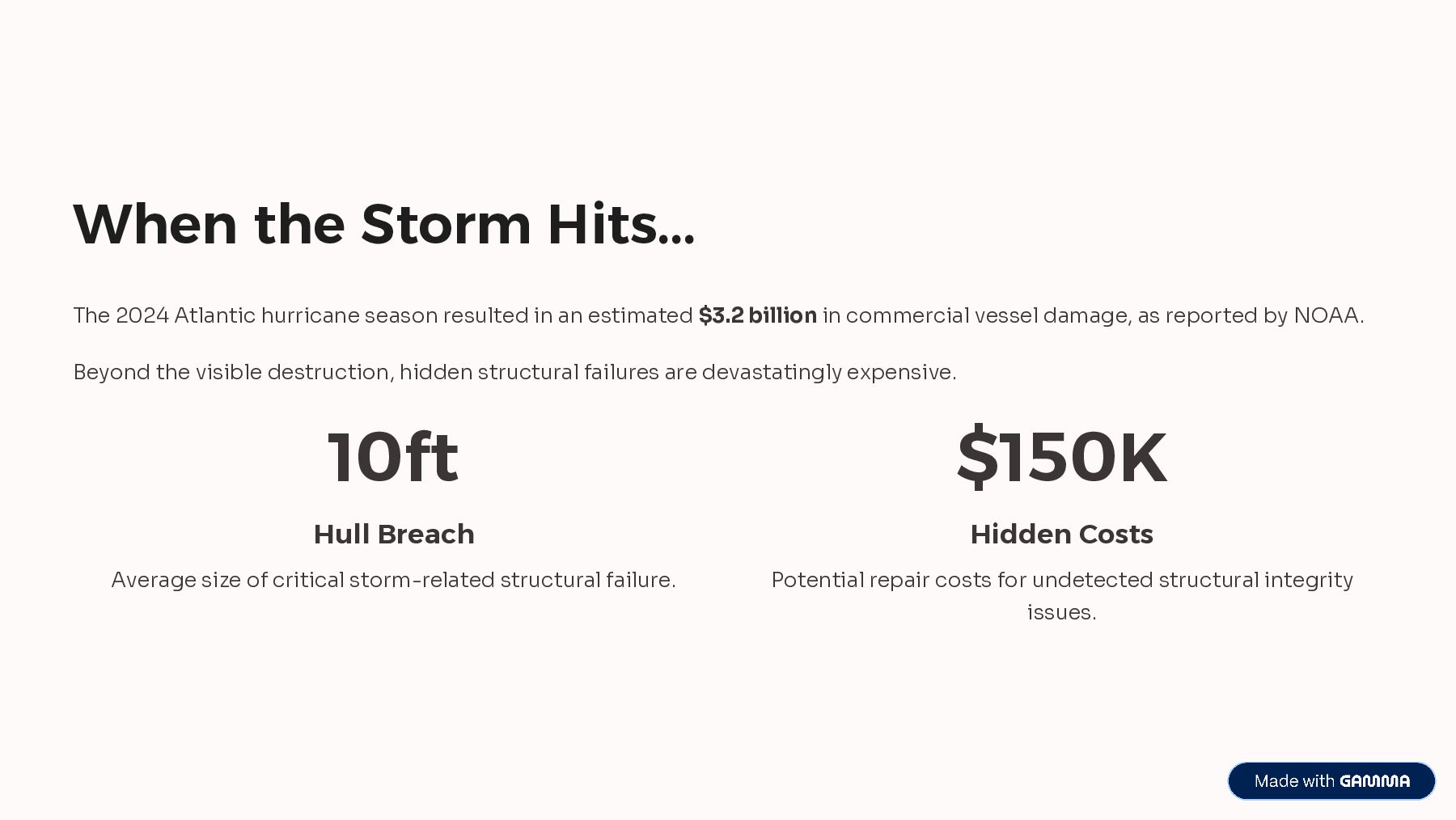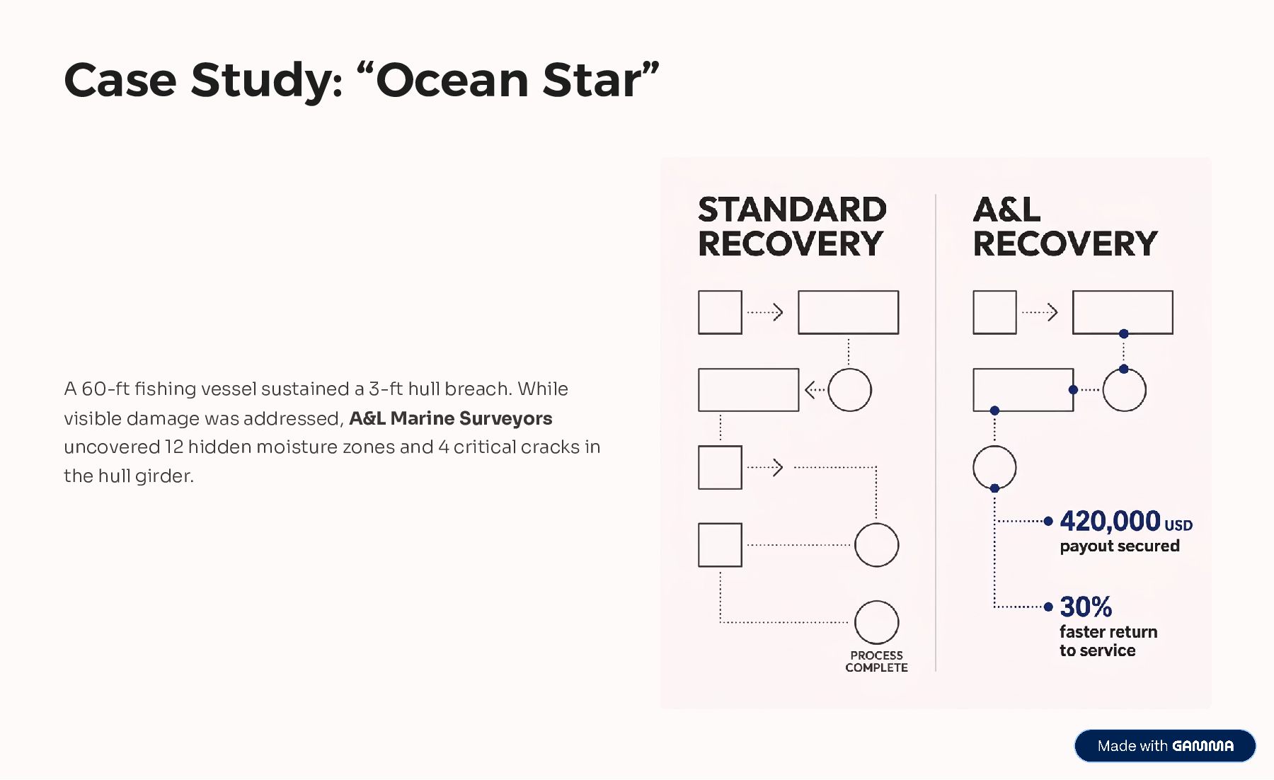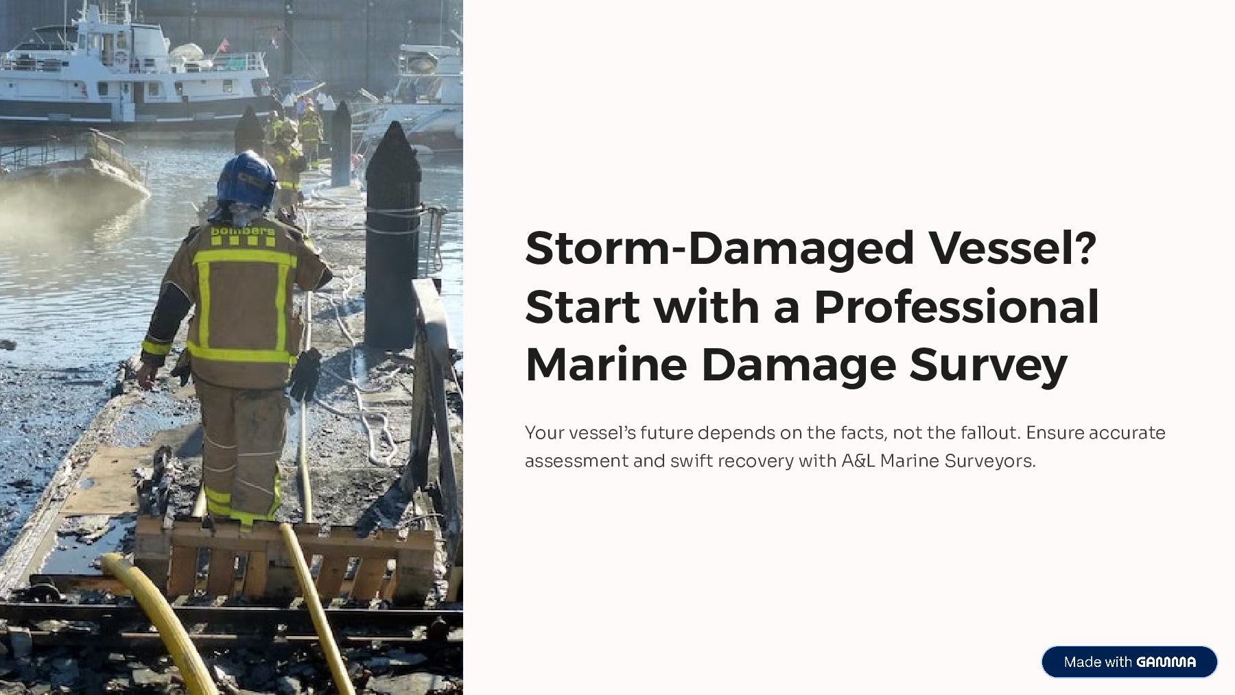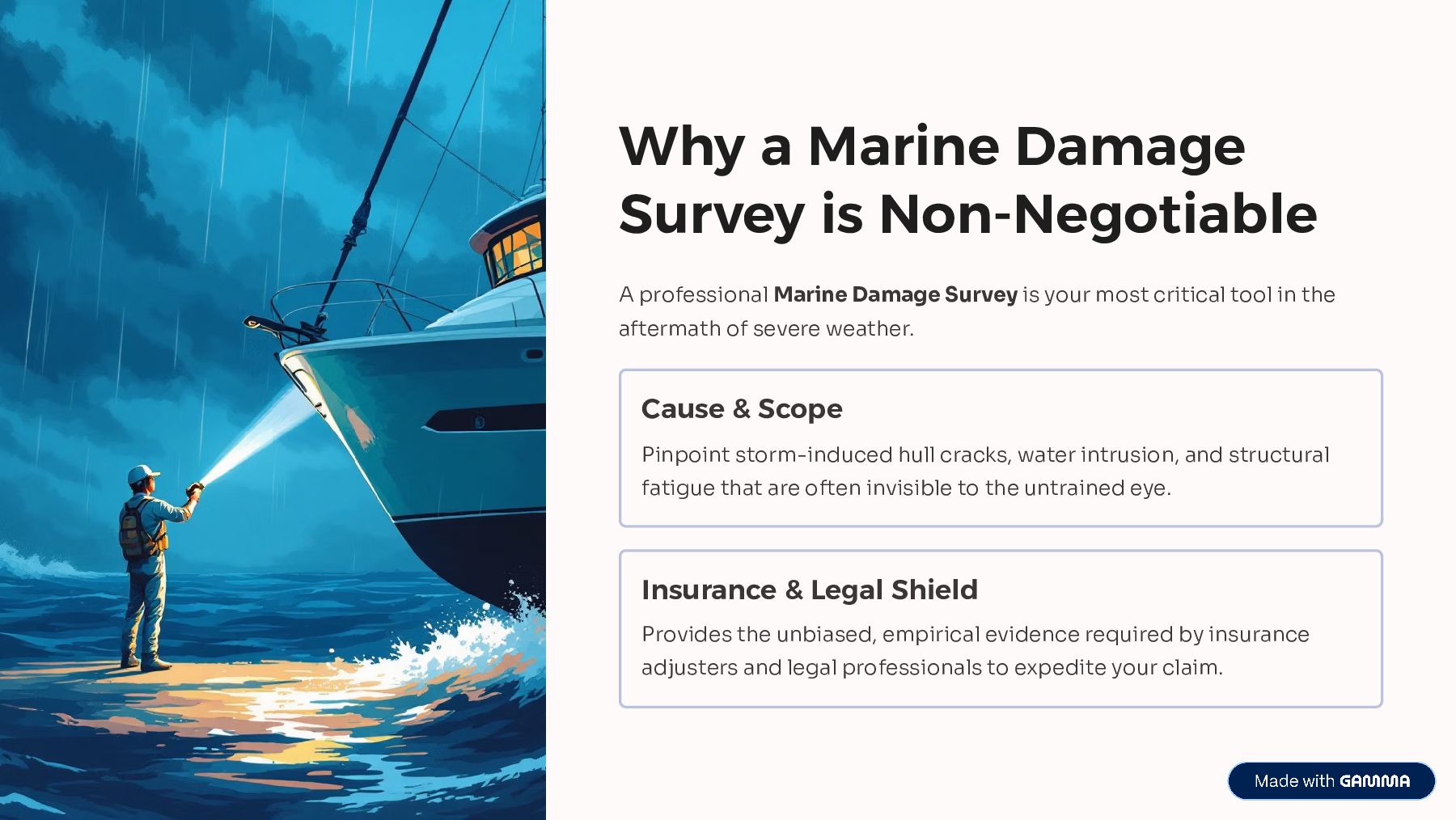 Storm-damaged vessels require careful inspection to identify structural issues, water intrusion, and mechanical risks. A&L Marine Surveyors, LLC performs professional marine damage surveys, providing clear reports that help owners understand losses, support insurance claims, and plan safe repairs and recovery.