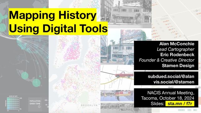 It's easy to think that our current maps represent a 1:1 relationship with the world as it is now; Google and others have given us tools to be able to navigate so effortlessly that the problem of mapping seems solved. Going back in time, though, presents a different set of challenges. Historical maps and spatial representations operate according to a different set of rules than our current maps do, and much can be lost in translation. Using examples from Stamen projects for the Alan Turing Institute, Columbia University, the Getty Institute, the University of Richmond, and Densho's maps of Japanese-American internment camps, among others, this talk will offer an overview of the problem space of historical mapping in a digital context, as well as provide examples of solutions arrived at through hard-won grapplings with sometimes difficult histories.