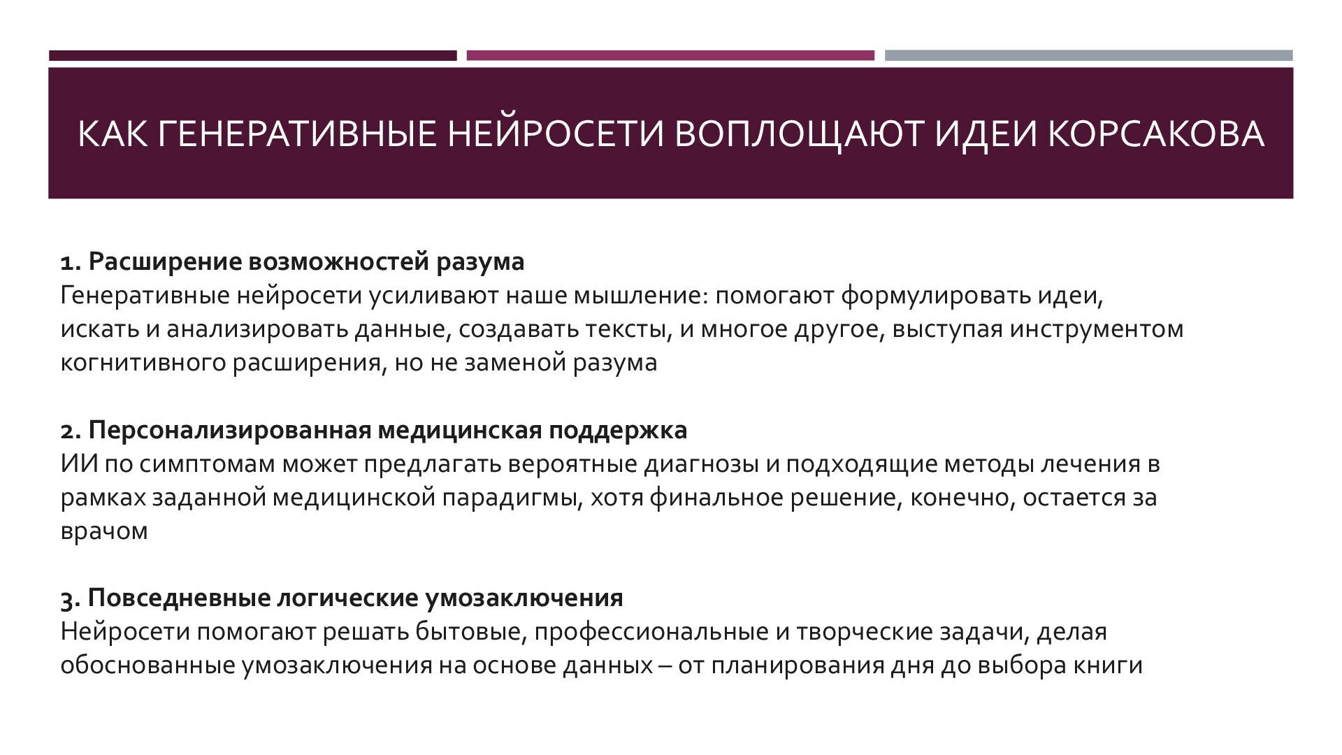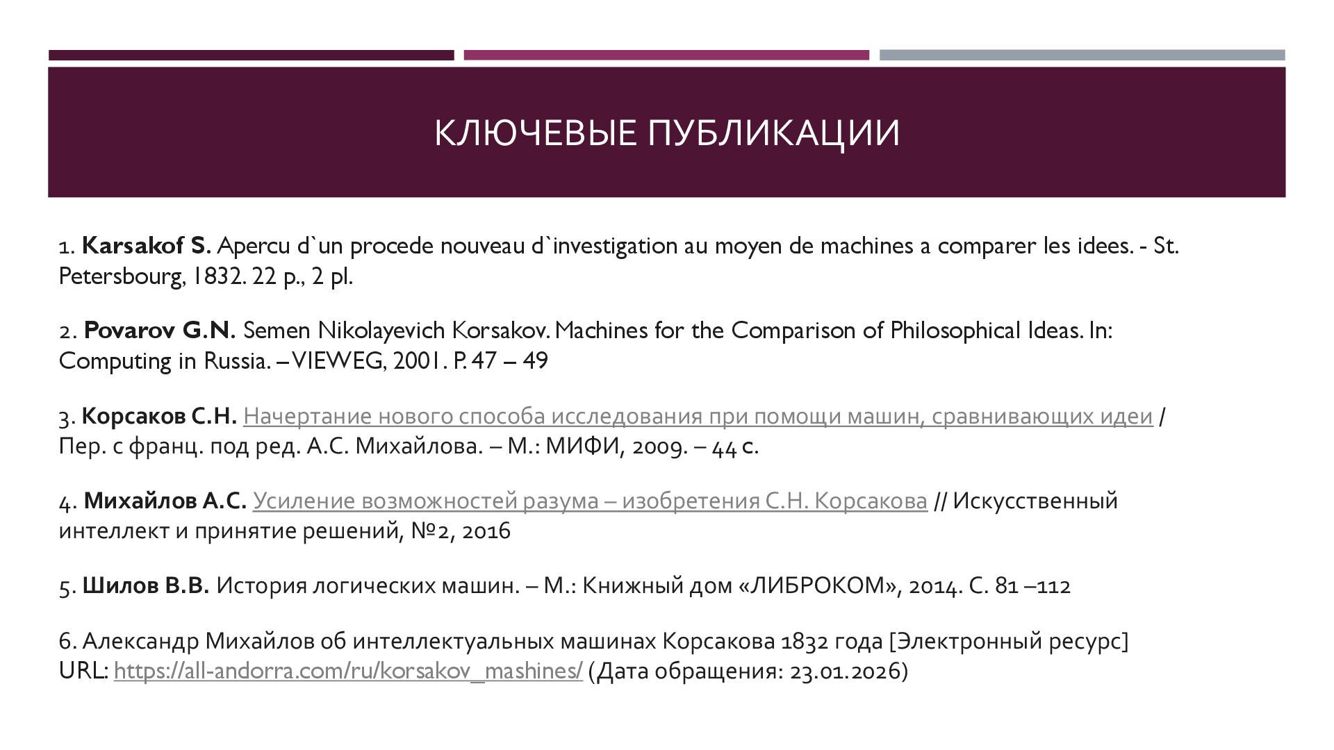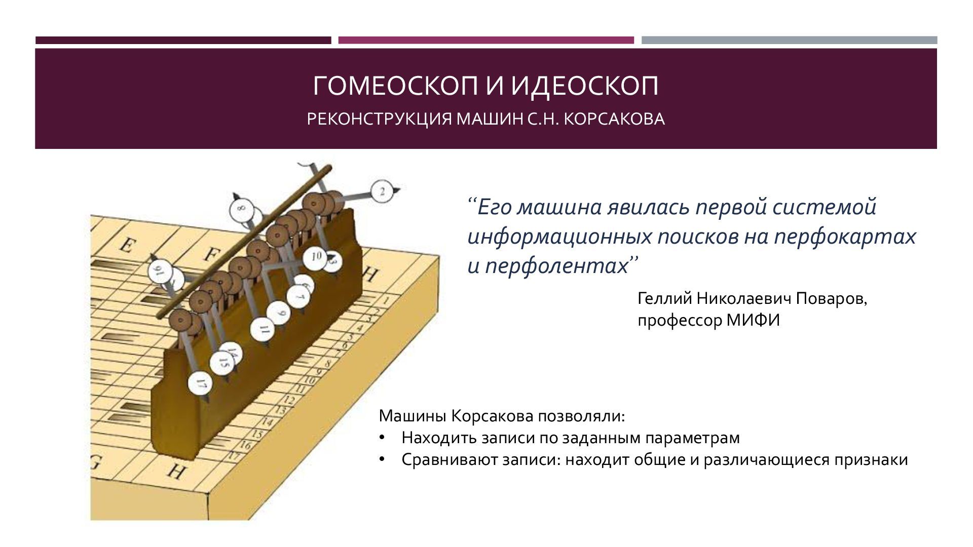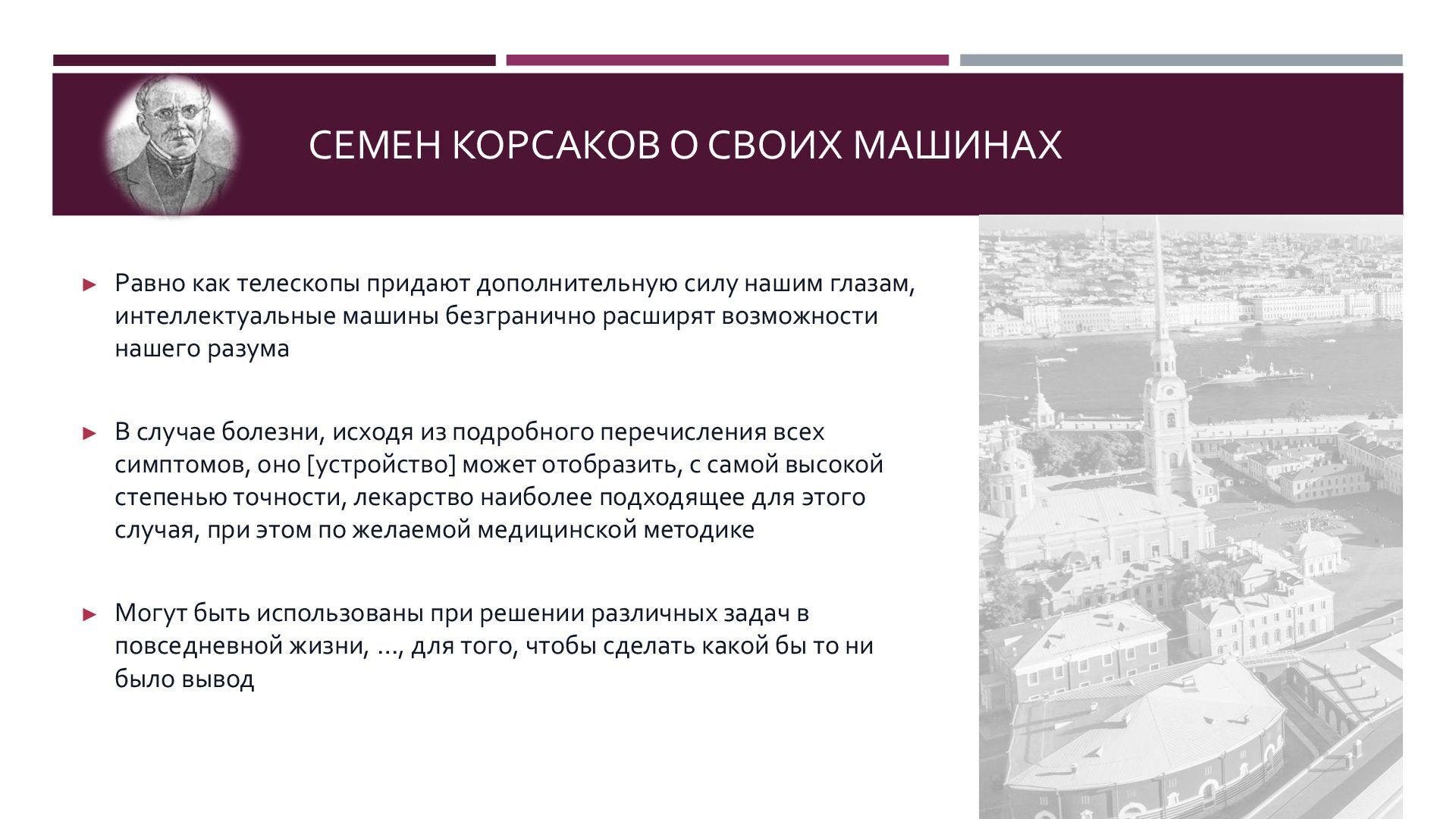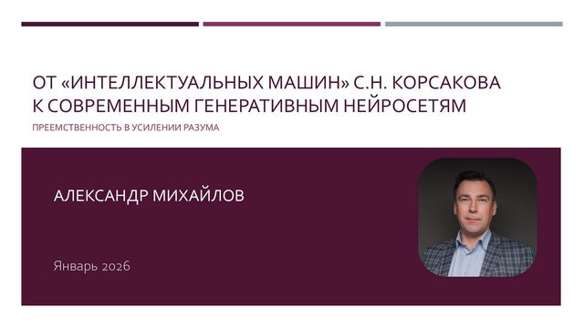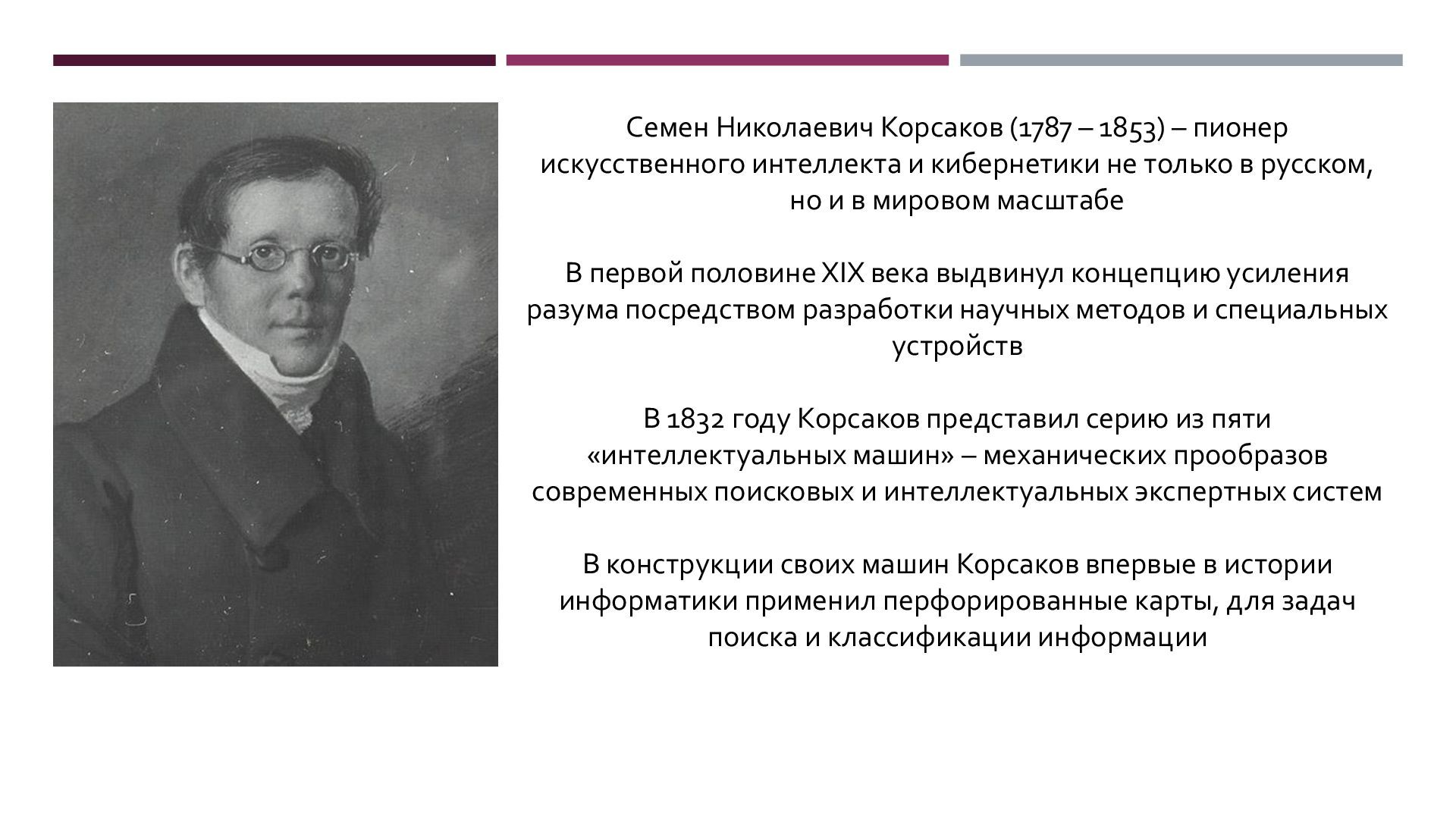 Семен Николаевич Корсаков (1787 – 1853) является пионером искусственного интеллекта, в 1832 году предложил серию механических «интеллектуальных машин» для поиска и классификации информации. В конструкции своих машин Корсаков впервые в истории информатики использовал перфорированные карты. Корсаков четко изложил ныне популярную концепцию искусственного разума как усилителя естественного. Многое из того, о чем мечтал Корсаков в наши дни реализуют генеративные нейросети.