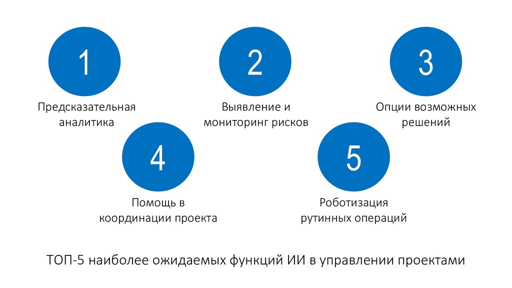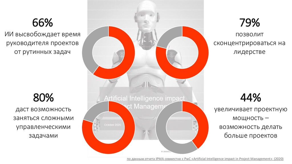даст возможность заняться сложными управленческими задачами 79% позволит сконцентрироваться на лидерстве 44% увеличивает проектную мощность – возможность делать больше проектов по данным отчета IPMA совместно с PwC «Artificial Intelligence impact in Project Management» (2020)