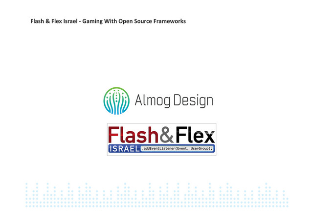 in Israel (non-‐profit). Flash and Flex Israel consists of professionals of all skill levels who gather monthly to share informa,on and stay on top of what is new in our ever-‐ changing industry, as well as experience new ideas and concepts. Next mee=ng to TBA Flash Israel is an annual tech event bring together great speakers from aboard covering a number of topics. Flash and Flex Israel – Flash Israel 2011