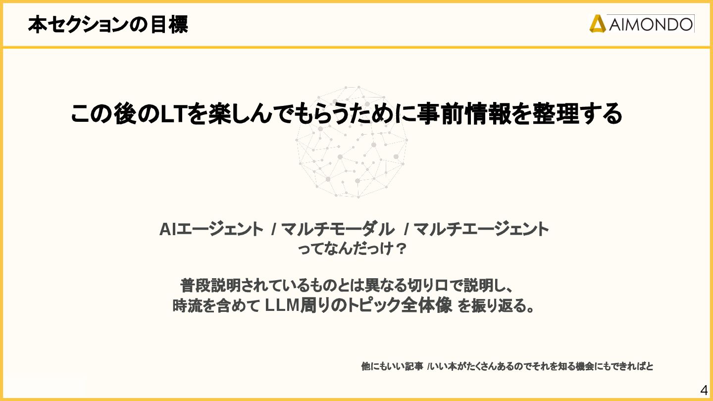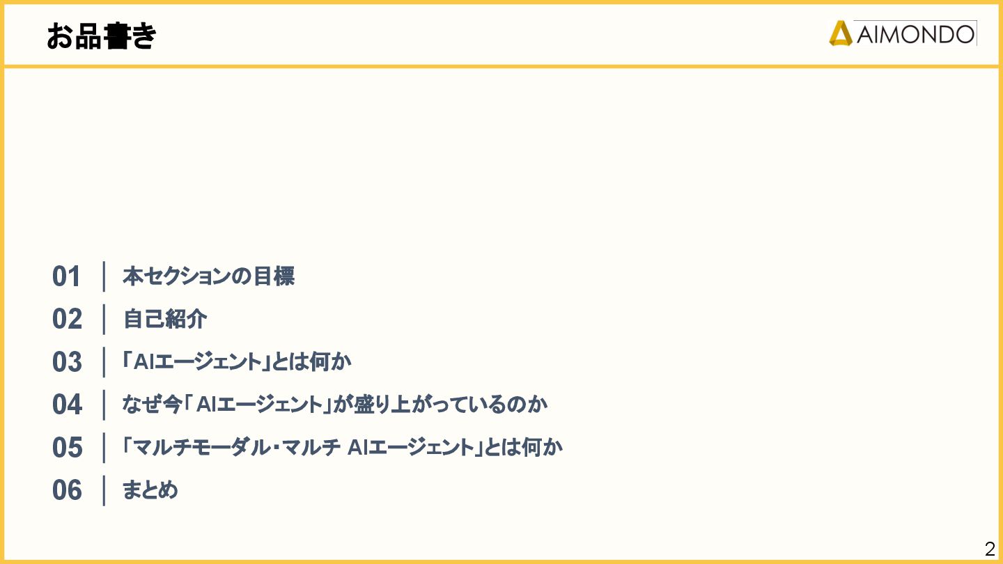 お品書き 2 01 本セクションの目標 02 自己紹介 03 「AIエージェント」とは何か 05 「マルチモーダル・マルチ