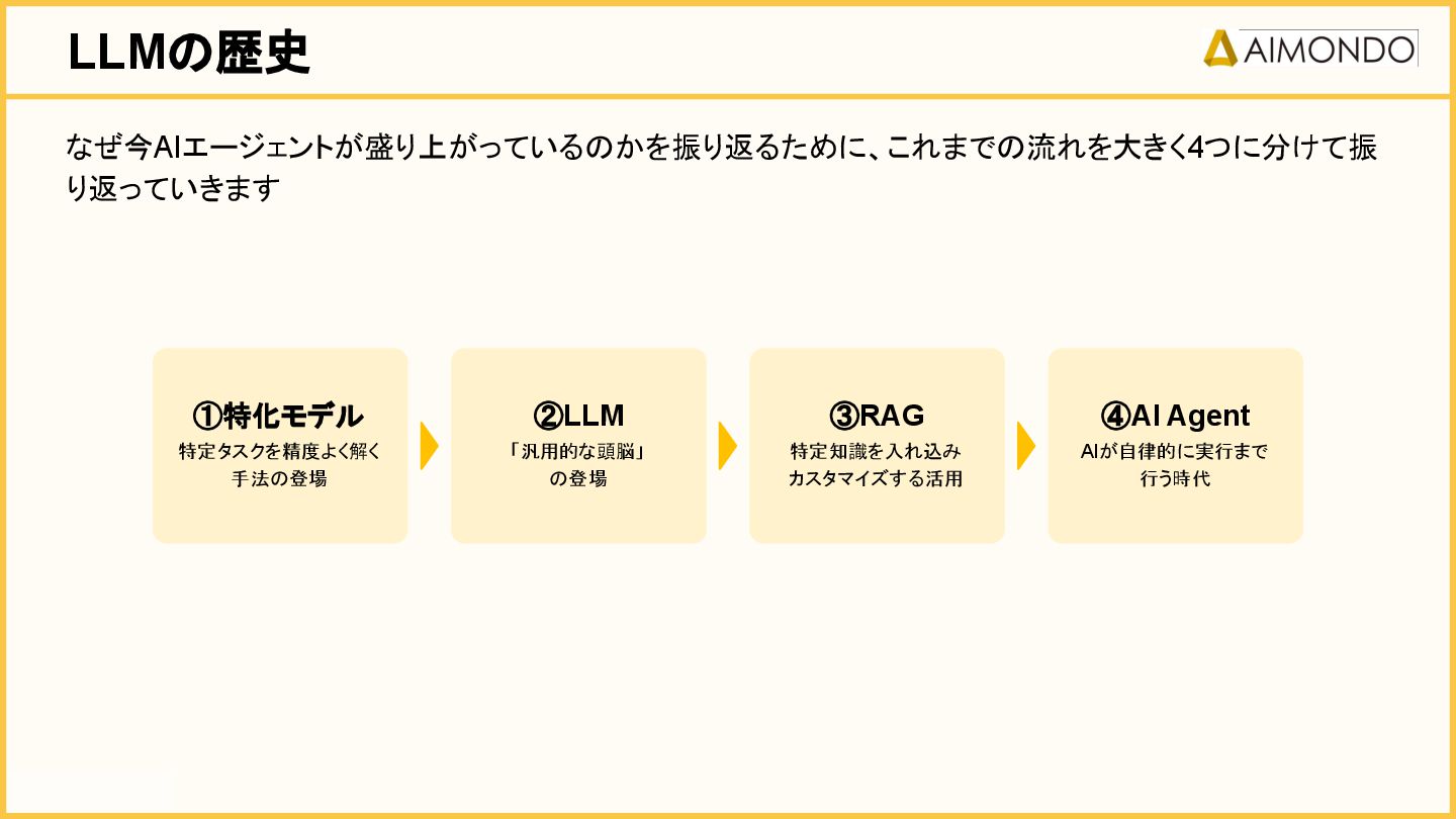confidential ④AI Agent(2025~※) 「人間が目標を設定する」「目標を達成するための計画を行う」「環境と相互作用する」「自分でタスクを実 行する」AIエージェントの流行 ①特化モデル 特定タスクを精度よく解く 手法の登場 ④AI Agent