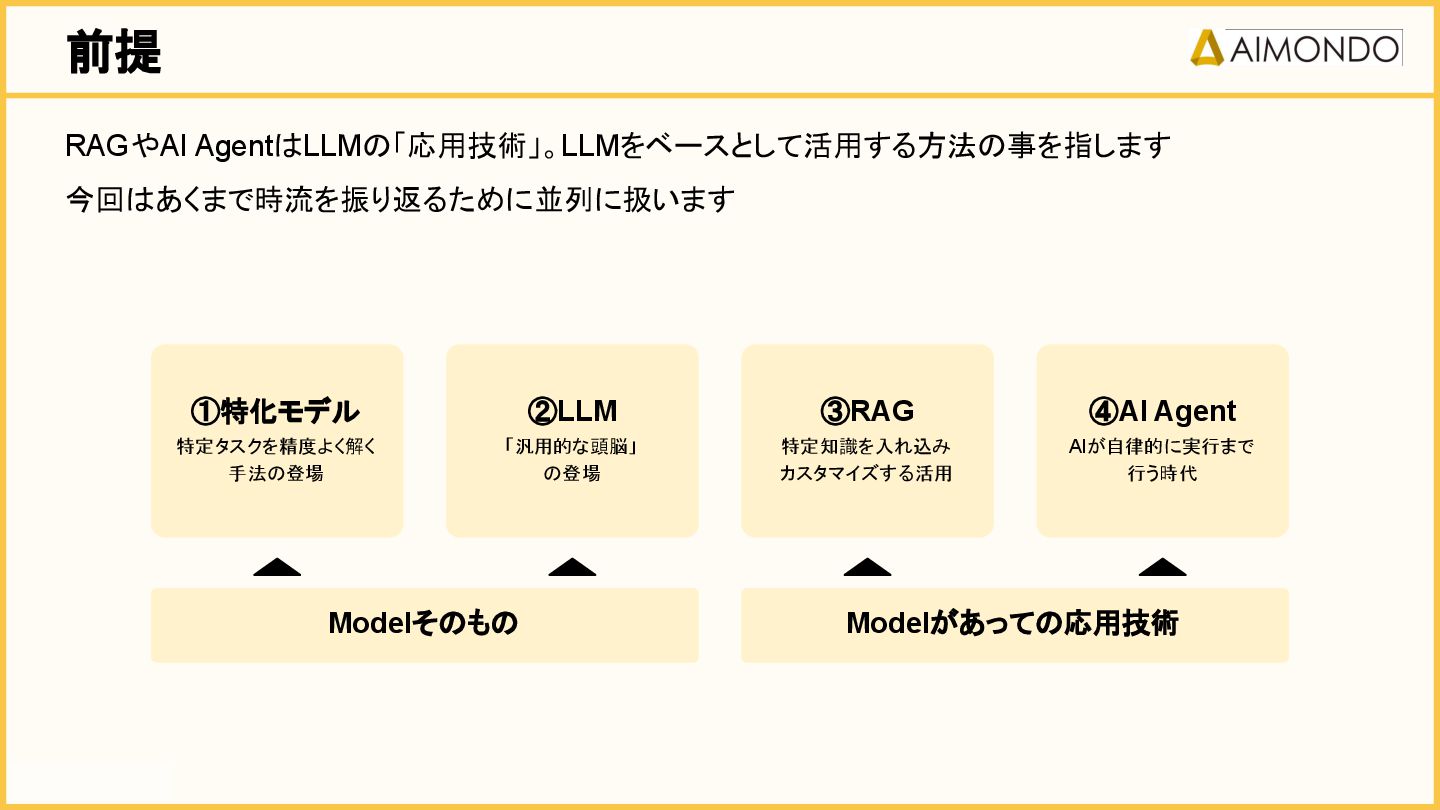 confidential 前提 Modelがあっての応用技術 RAGやAI AgentはLLMの「応用技術」。LLMをベースとして活用する方法の事を指します 今回はあくまで時流を振り返るために並列に扱います ①特化モデル 特定タスクを精度よく解く 手法の登場 ②LLM