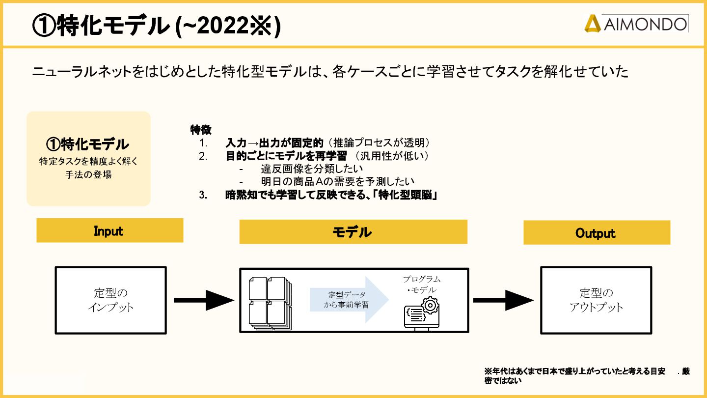 - 違反画像を分類したい - 明日の商品Aの需要を予測したい 3. 暗黙知でも学習して反映できる、「特化型頭脳」 定型の インプット 定型の アウトプット 定型データ から事前学習 プログラム ・モデル ニューラルネットをはじめとした特化型モデルは、各ケースごとに学習させてタスクを解化せていた ①特化モデル 特定タスクを精度よく解く 手法の登場 Input モデル Output ※年代はあくまで日本で盛り上がっていたと考える目安 . 厳 密ではない