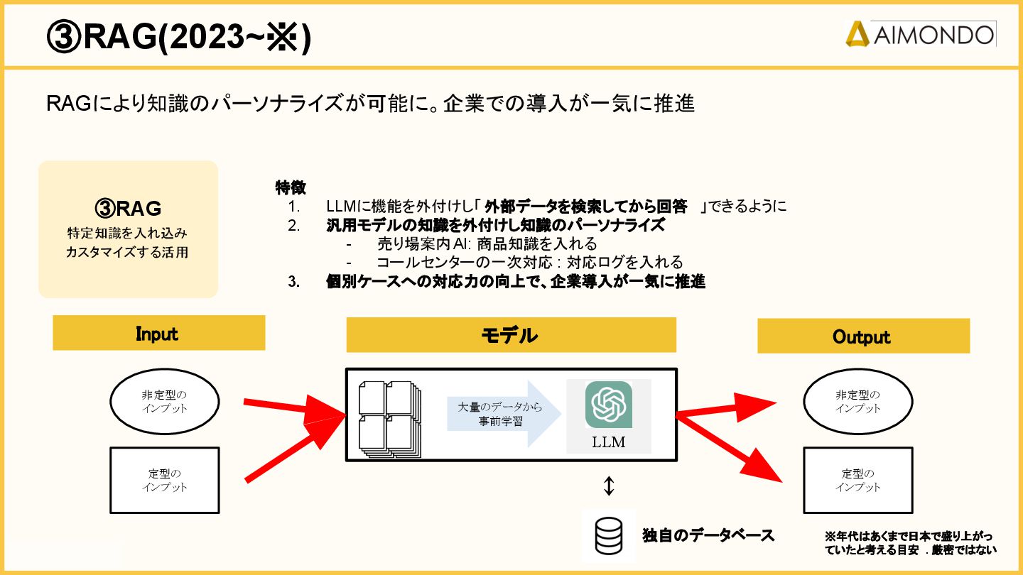 インプット 定型の インプット 特徴 1. LLMに機能を外付けし「 外部データを検索してから回答 」できるように 2. 汎用モデルの知識を外付けし知識のパーソナライズ - 売り場案内AI: 商品知識を入れる - コールセンターの一次対応 : 対応ログを入れる 3. 個別ケースへの対応力の向上で、企業導入が一気に推進 RAGにより知識のパーソナライズが可能に。企業での導入が一気に推進 Input モデル Output ①特化モデル 特定タスクを精度よく解く 手法の登場 ③RAG 特定知識を入れ込み カスタマイズする活用 ↕ 独自のデータベース ※年代はあくまで日本で盛り上がっ ていたと考える目安 . 厳密ではない