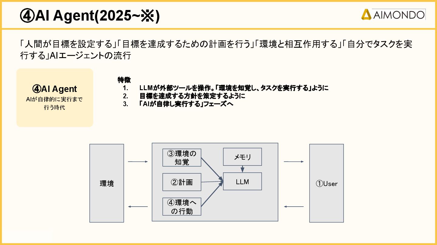 AIが自律的に実行まで 行う時代 特徴 1. LLMが外部ツールを操作。「環境を知覚し、タスクを実行する」ように 2. 目標を達成する方針を策定するように 3. 「AIが自律し実行する」フェーズへ 環境 ③環境の 知覚 ②計画 ④環境へ の行動 メモリ LLM ①User