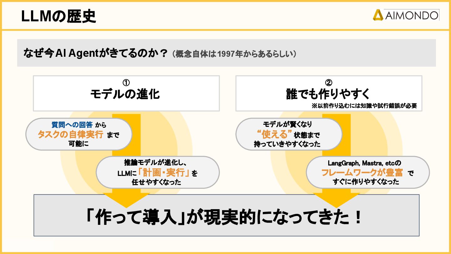 推論モデルが進化し、 LLMに 「計画・実行」 を 任せやすくなった モデルが賢くなり “使える” 状態まで 持っていきやすくなった LangGraph, Mastra, etcの フレームワークが豊富 で すぐに作りやすくなった 「作って導入」が現実的になってきた! ① モデルの進化 ② 誰でも作りやすく ※以前作り込むには知識や試行錯誤が必要