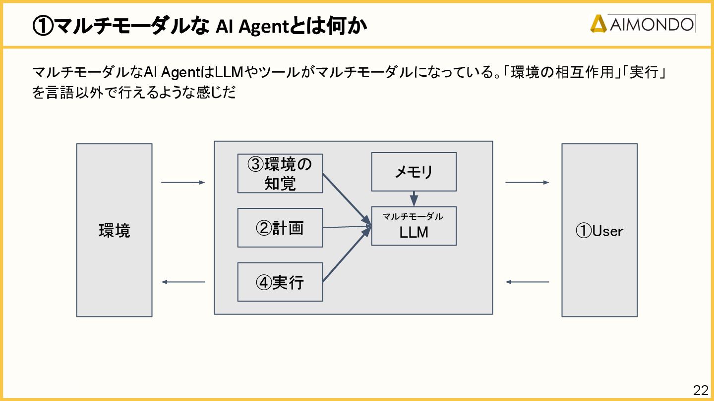 ③環境の 知覚 ②計画 ④実行 メモリ マルチモーダル LLM ①User ③環境の 知覚 ②計画 ④実行 メモリ マルチモーダル LLM