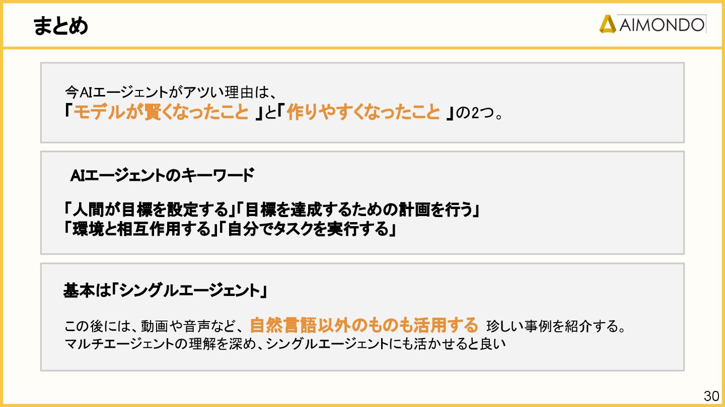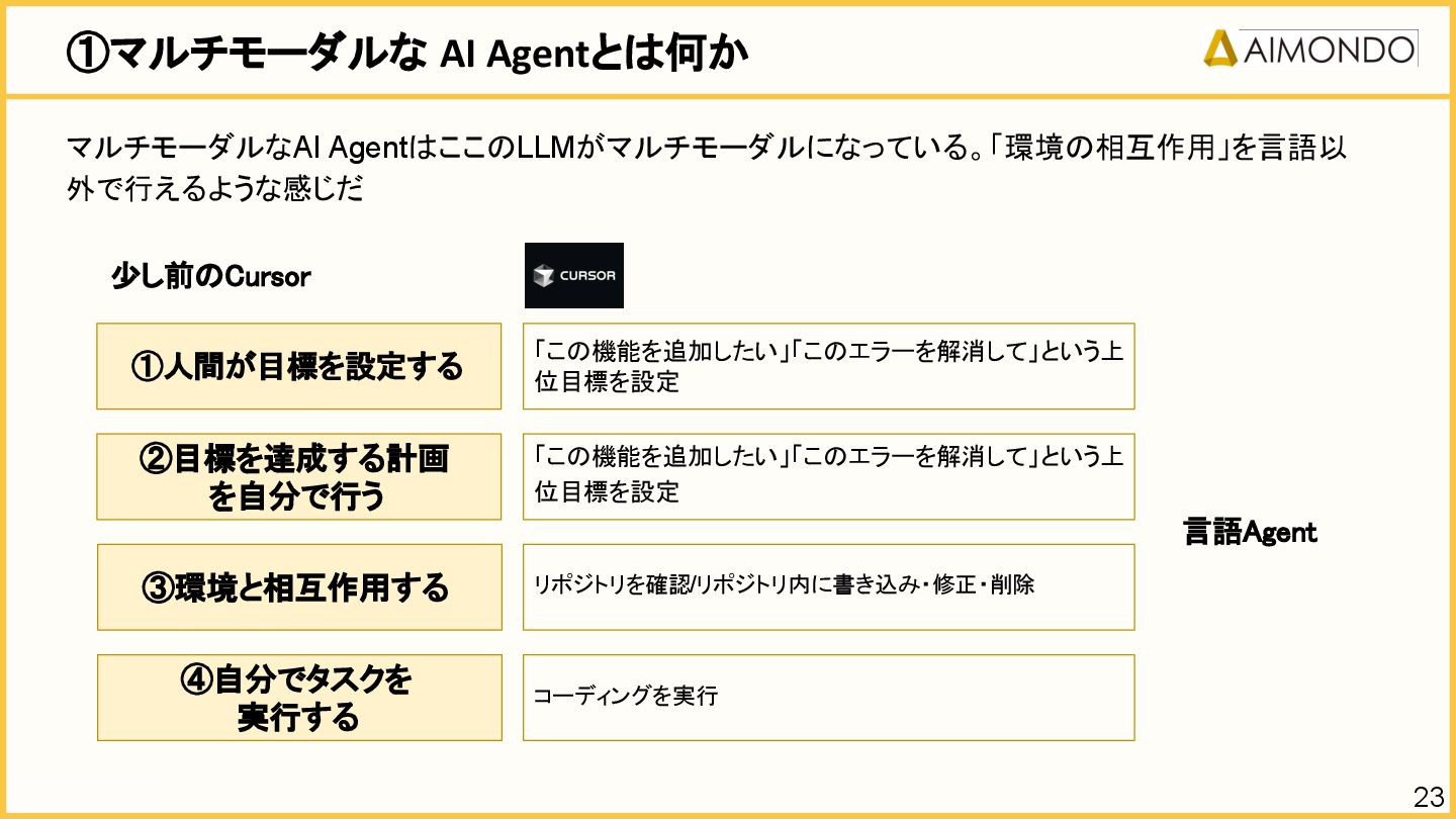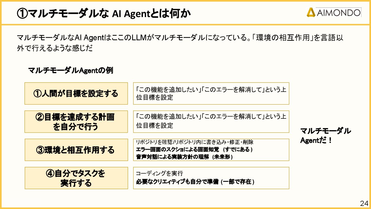 位目標を設定 ②目標を達成する計画 を自分で行う 「この機能を追加したい」「このエラーを解消して」という上 位目標を設定 ③環境と相互作用する リポジトリを確認/リポジトリ内に書き込み・修正・削除 エラー画面のスクショによる画面知覚 (すでにある ) 音声対話による実装方針の理解 (未来形) ④自分でタスクを 実行する コーディングを実行 必要なクリエィティブも自分で準備 (一部で存在) マルチモーダルAgentの例 マルチモーダル Agentだ!