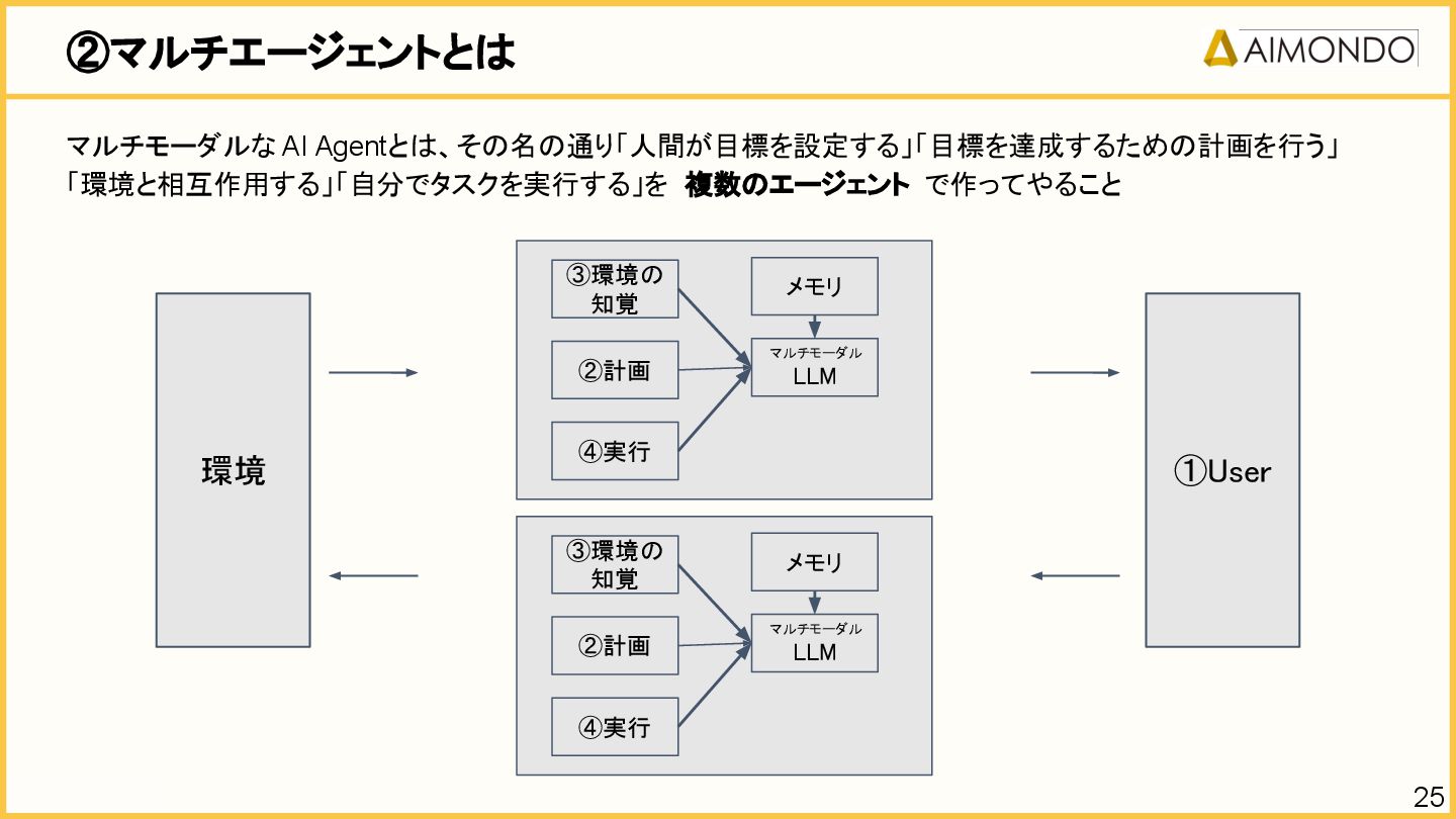 confidential ①マルチモーダルな AI Agentとは何か 24 マルチモーダルなAI AgentはここのLLMがマルチモーダルになっている。「環境の相互作用」を言語以 外で行えるような感じだ ①人間が目標を設定する 「この機能を追加したい」「このエラーを解消して」という上