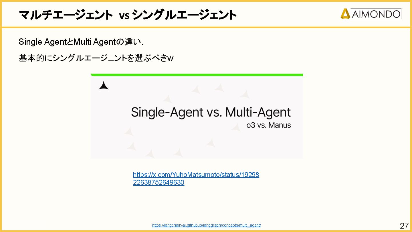 confidential マルチエージェント vs シングルエージェント 27 Single AgentとMulti Agentの違い. 基本的にシングルエージェントを選ぶべきw https://langchain-ai.github.io/langgraph/concepts/multi_agent/