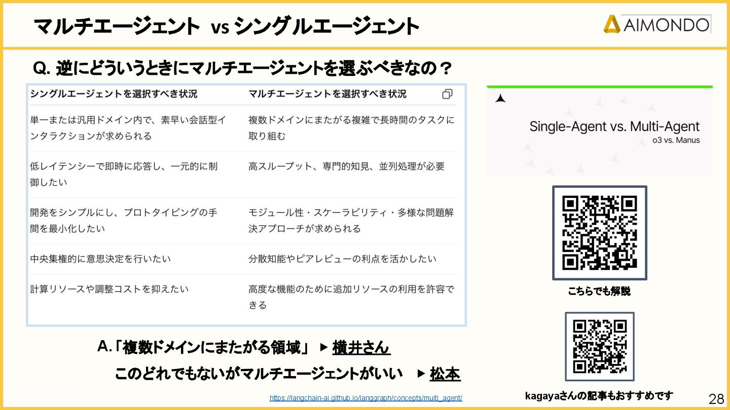 横井さん このどれでもないがマルチエージェントがいい ▶ 松本 A. kagayaさんの記事もおすすめです こちらでも解説