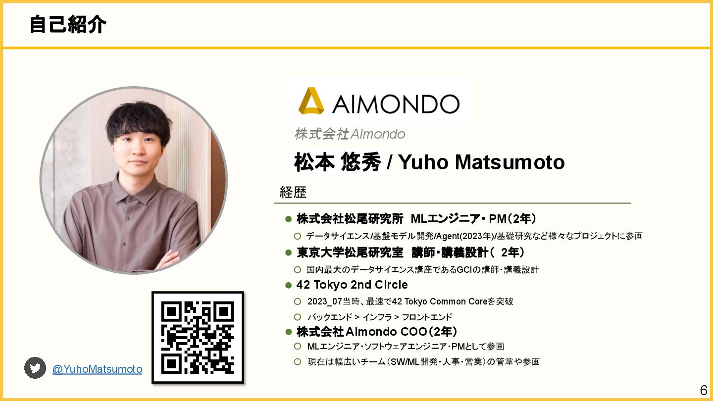 株式会社Almondo 松本 悠秀 / Yuho Matsumoto 経歴 @YuhoMatsumoto 株式会社松尾研究所 MLエンジニア・