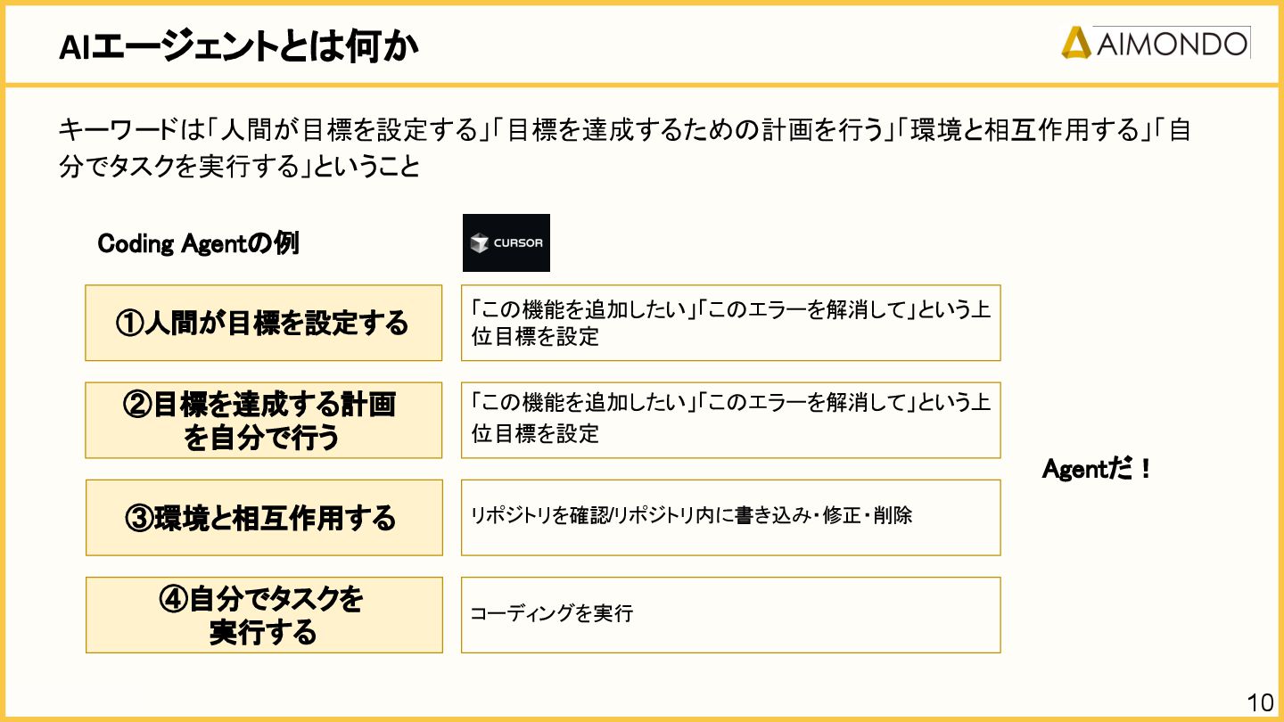 confidential AIエージェントとは何か 10 キーワードは「人間が目標を設定する」「目標を達成するための計画を行う」「環境と相互作用する」「自 分でタスクを実行する」ということ ①人間が目標を設定する 「この機能を追加したい」「このエラーを解消して」という上 位目標を設定 ②目標を達成する計画