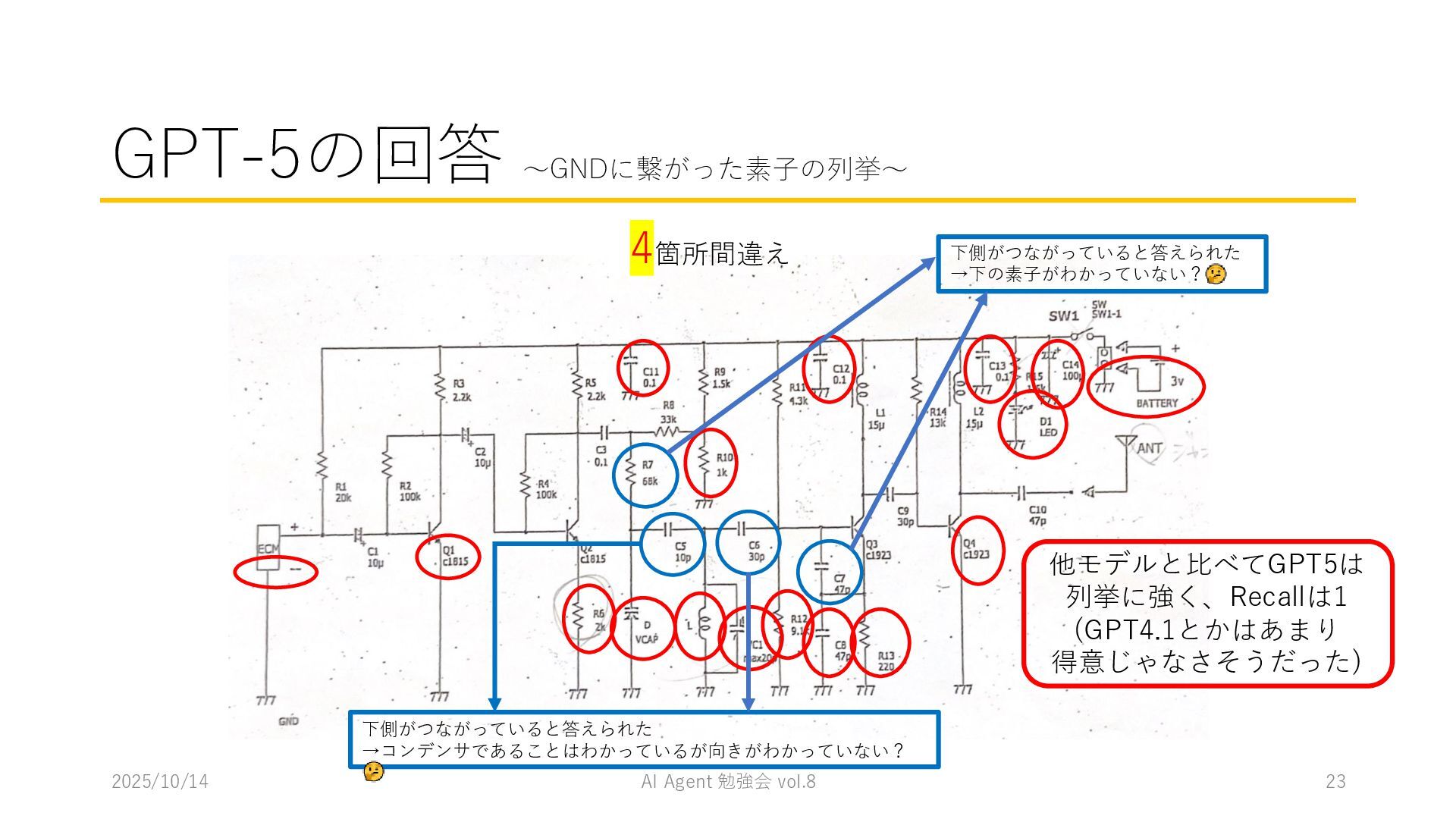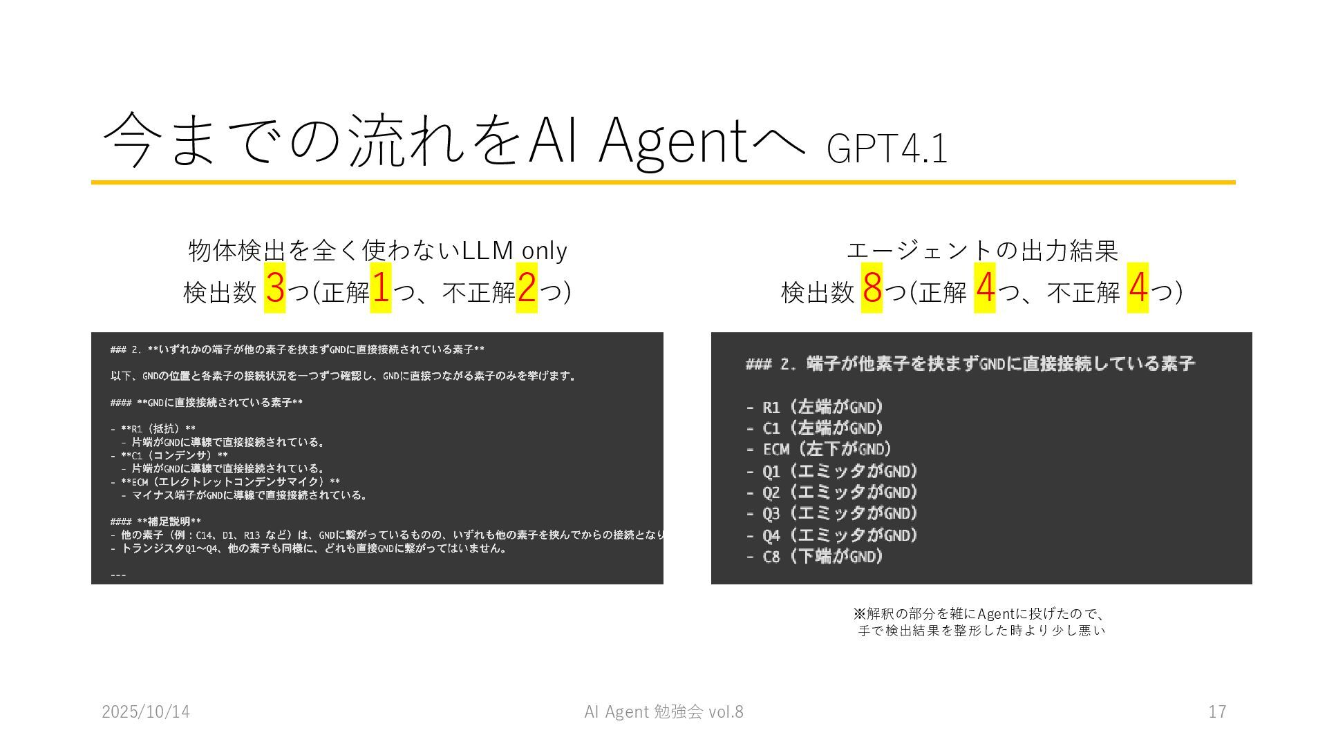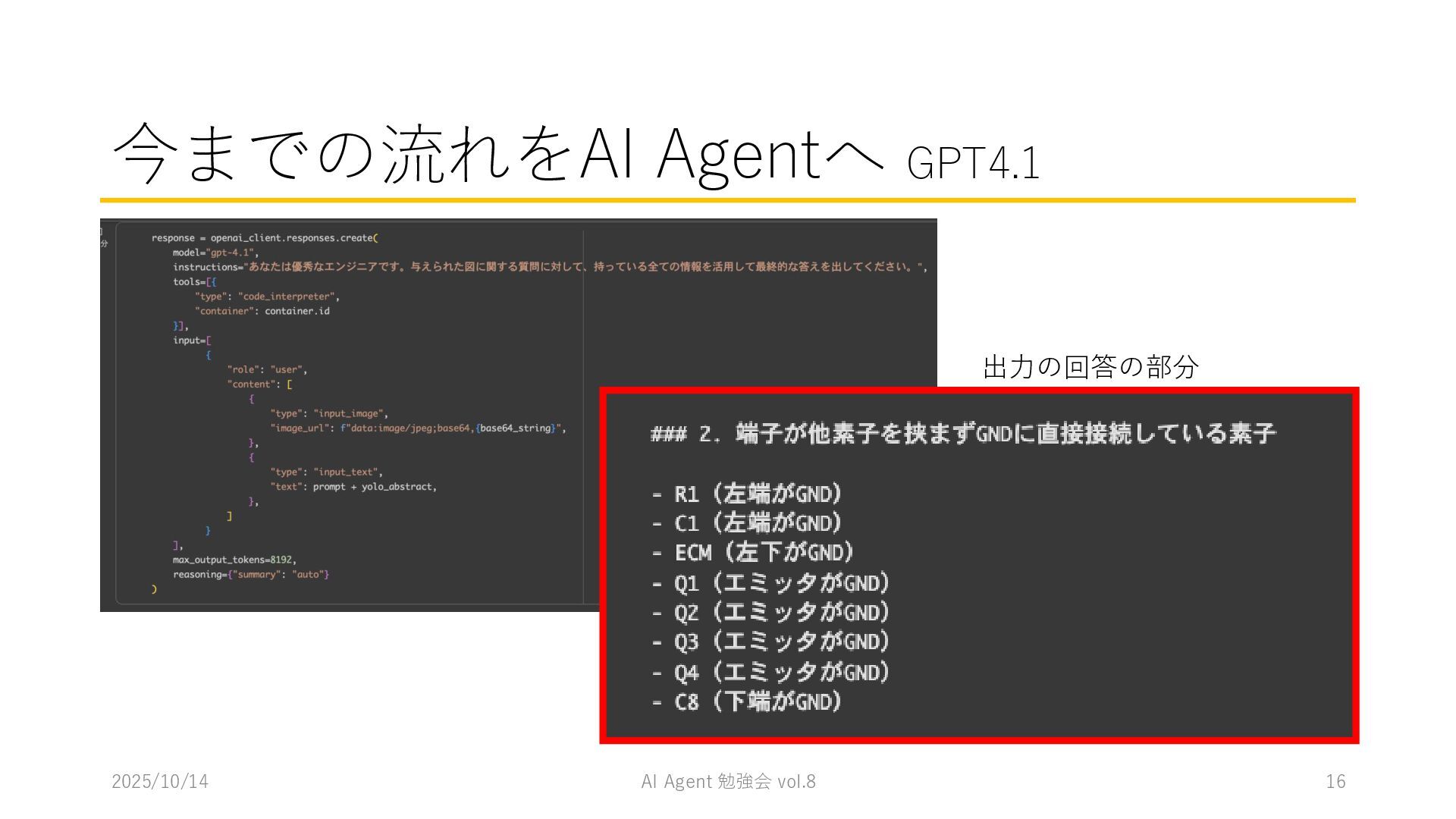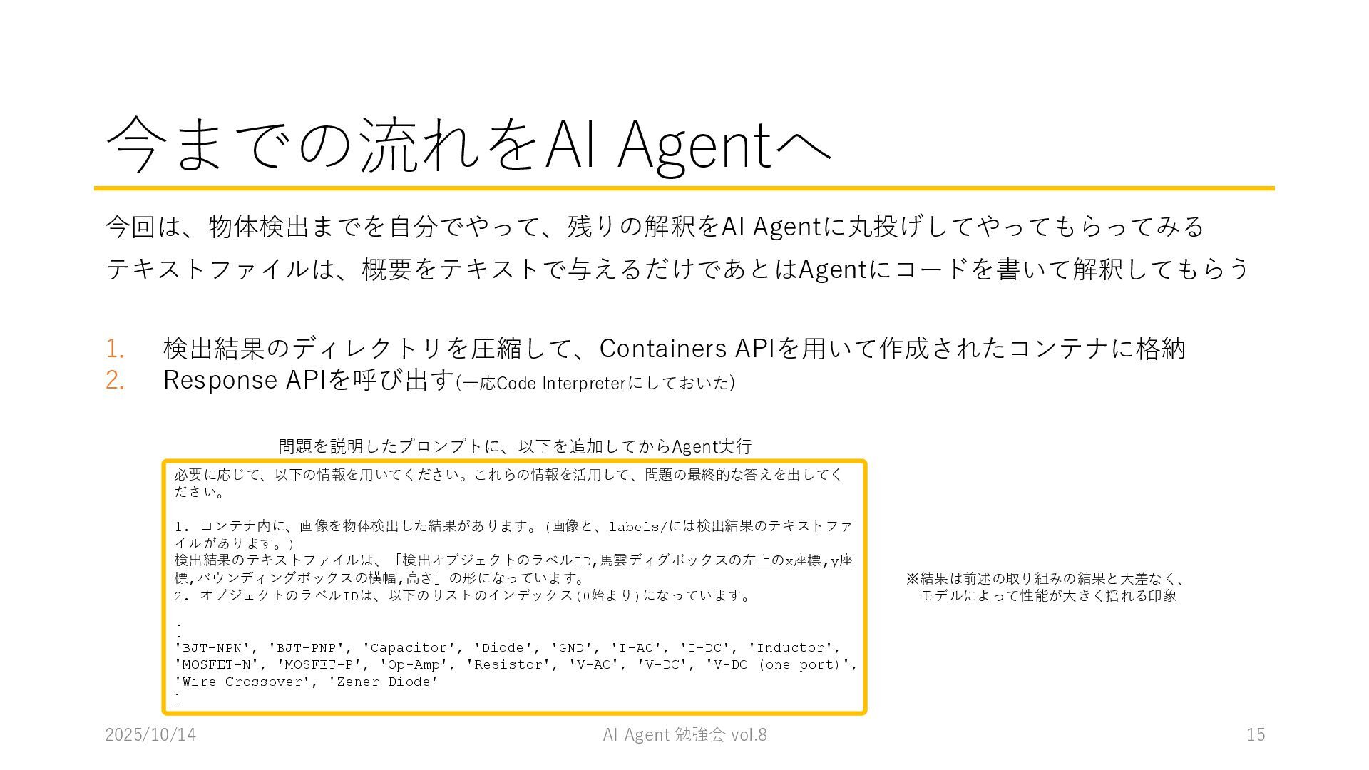 15 必要に応じて、以下の情報を用いてください。これらの情報を活用して、問題の最終的な答えを出してく ださい。 1. コンテナ内に、画像を物体検出した結果があります。(画像と、labels/には検出結果のテキストファ イルがあります。) 検出結果のテキストファイルは、「検出オブジェクトのラベルID,馬雲ディグボックスの左上のx座標,y座 標,バウンディングボックスの横幅,高さ」の形になっています。 2. オブジェクトのラベルIDは、以下のリストのインデックス(0始まり)になっています。 [ 'BJT-NPN', 'BJT-PNP', 'Capacitor', 'Diode', 'GND', 'I-AC', 'I-DC', 'Inductor', 'MOSFET-N', 'MOSFET-P', 'Op-Amp', 'Resistor', 'V-AC', 'V-DC', 'V-DC (one port)', 'Wire Crossover', 'Zener Diode' ] 問題を説明したプロンプトに、以下を追加してからAgent実行 1. 検出結果のディレクトリを圧縮して、Containers APIを用いて作成されたコンテナに格納 2. Response APIを呼び出す(一応Code Interpreterにしておいた) ※結果は前述の取り組みの結果と大差なく、 モデルによって性能が大きく揺れる印象