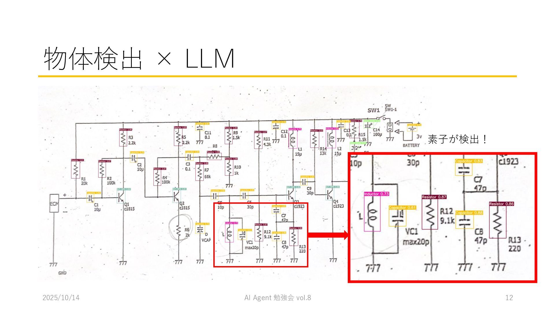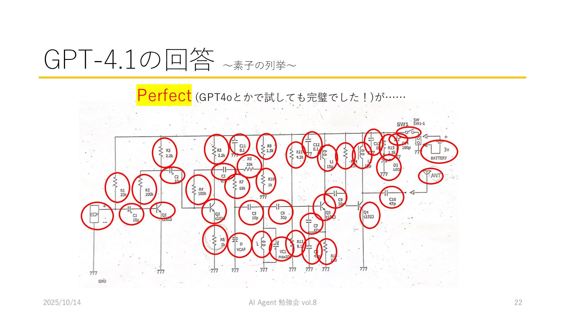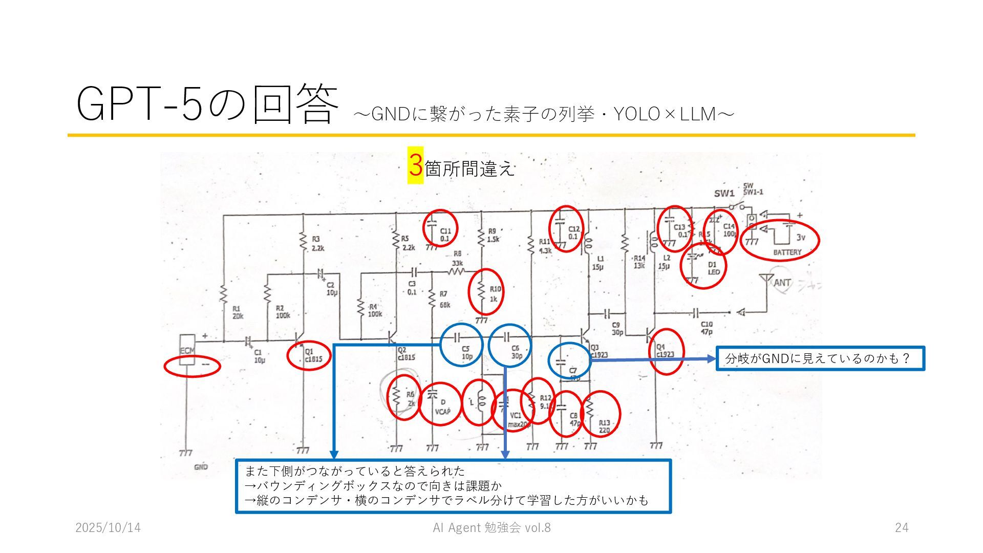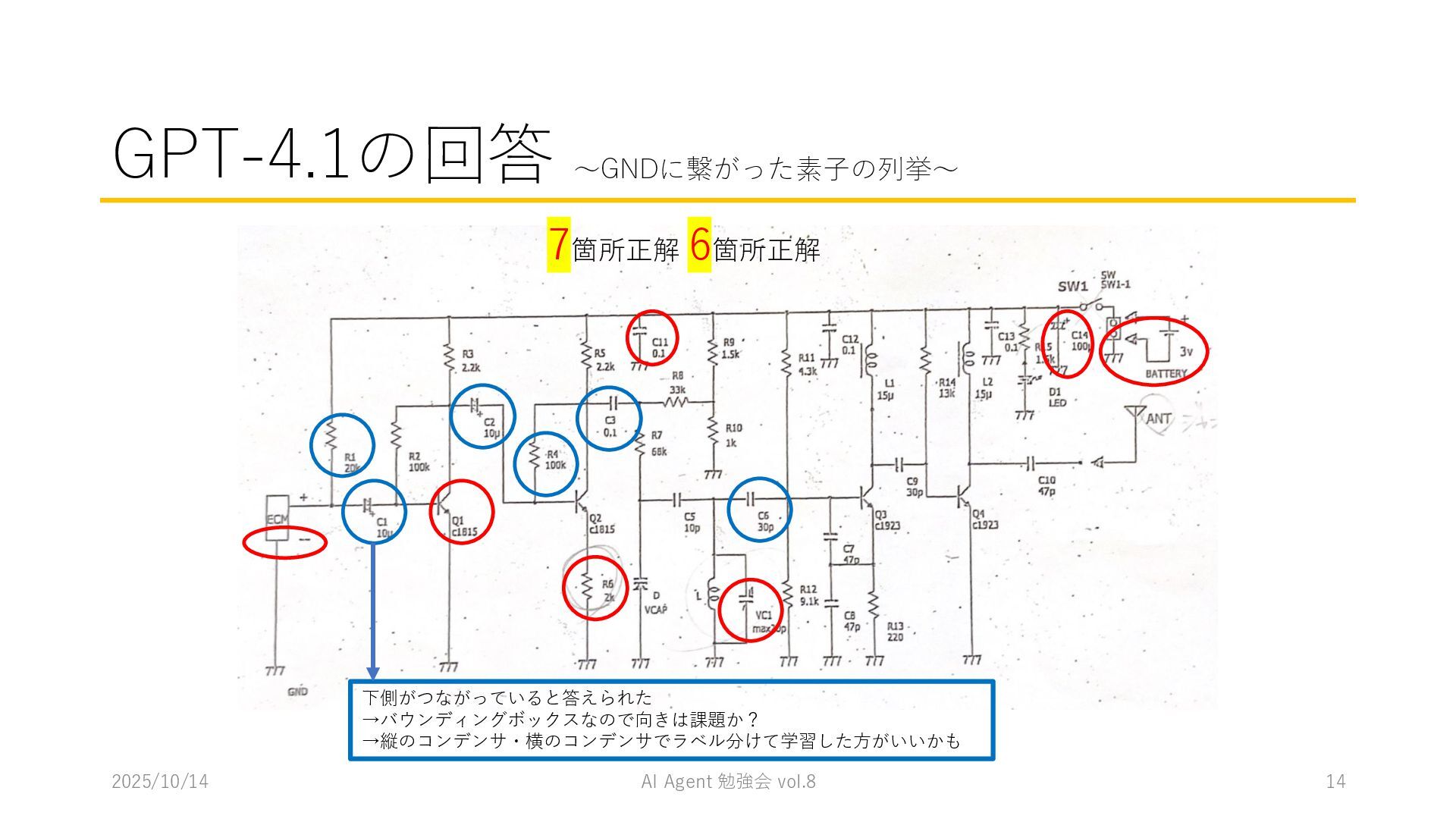 15 必要に応じて、以下の情報を用いてください。これらの情報を活用して、問題の最終的な答えを出してく ださい。 1. コンテナ内に、画像を物体検出した結果があります。(画像と、labels/には検出結果のテキストファ イルがあります。) 検出結果のテキストファイルは、「検出オブジェクトのラベルID,馬雲ディグボックスの左上のx座標,y座 標,バウンディングボックスの横幅,高さ」の形になっています。 2. オブジェクトのラベルIDは、以下のリストのインデックス(0始まり)になっています。 [ 'BJT-NPN', 'BJT-PNP', 'Capacitor', 'Diode', 'GND', 'I-AC', 'I-DC', 'Inductor', 'MOSFET-N', 'MOSFET-P', 'Op-Amp', 'Resistor', 'V-AC', 'V-DC', 'V-DC (one port)', 'Wire Crossover', 'Zener Diode' ] 問題を説明したプロンプトに、以下を追加してからAgent実行 1. 検出結果のディレクトリを圧縮して、Containers APIを用いて作成されたコンテナに格納 2. Response APIを呼び出す(一応Code Interpreterにしておいた) ※結果は前述の取り組みの結果と大差なく、 モデルによって性能が大きく揺れる印象