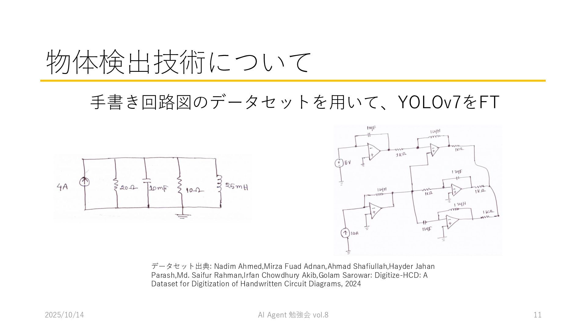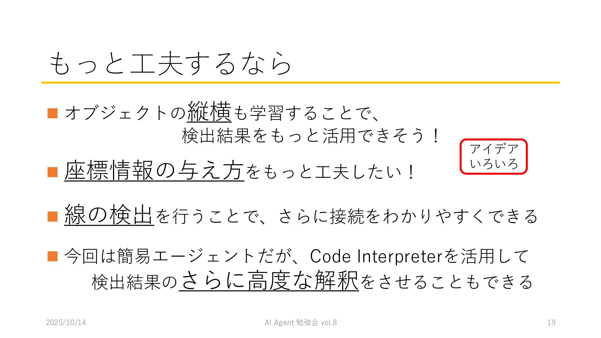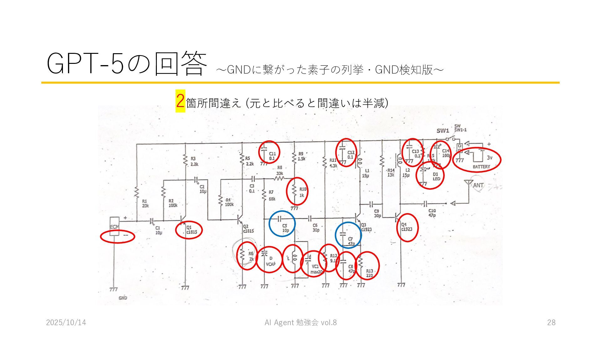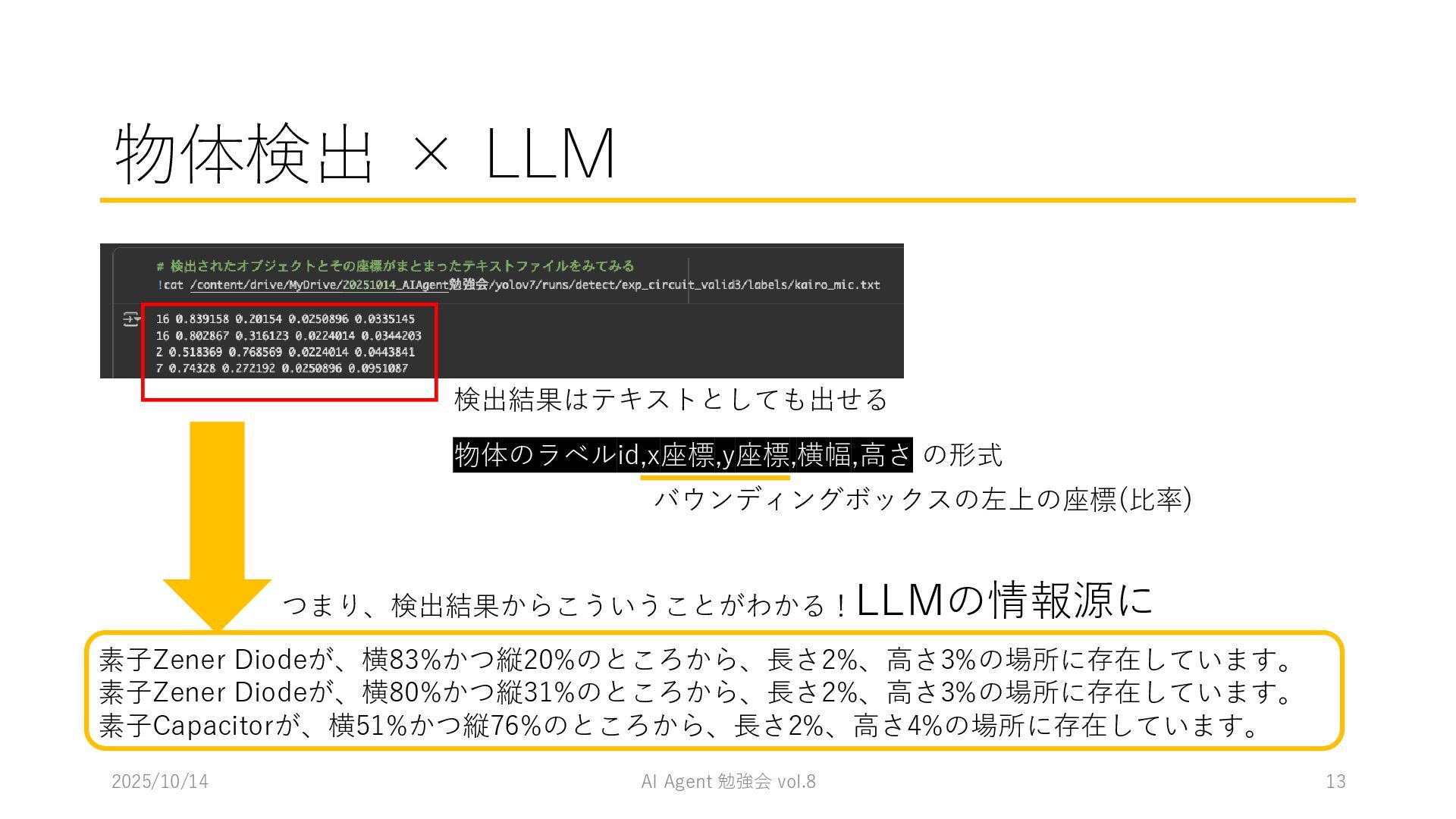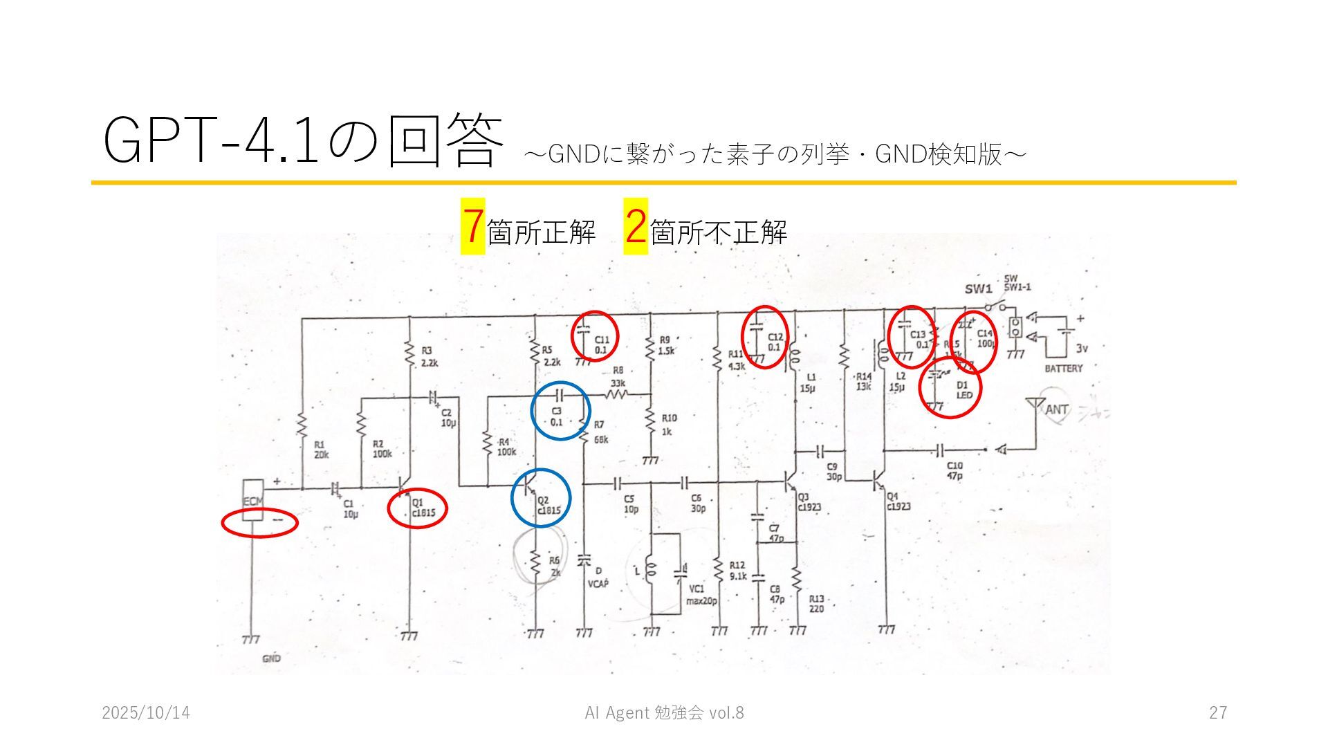 15 必要に応じて、以下の情報を用いてください。これらの情報を活用して、問題の最終的な答えを出してく ださい。 1. コンテナ内に、画像を物体検出した結果があります。(画像と、labels/には検出結果のテキストファ イルがあります。) 検出結果のテキストファイルは、「検出オブジェクトのラベルID,馬雲ディグボックスの左上のx座標,y座 標,バウンディングボックスの横幅,高さ」の形になっています。 2. オブジェクトのラベルIDは、以下のリストのインデックス(0始まり)になっています。 [ 'BJT-NPN', 'BJT-PNP', 'Capacitor', 'Diode', 'GND', 'I-AC', 'I-DC', 'Inductor', 'MOSFET-N', 'MOSFET-P', 'Op-Amp', 'Resistor', 'V-AC', 'V-DC', 'V-DC (one port)', 'Wire Crossover', 'Zener Diode' ] 問題を説明したプロンプトに、以下を追加してからAgent実行 1. 検出結果のディレクトリを圧縮して、Containers APIを用いて作成されたコンテナに格納 2. Response APIを呼び出す(一応Code Interpreterにしておいた) ※結果は前述の取り組みの結果と大差なく、 モデルによって性能が大きく揺れる印象