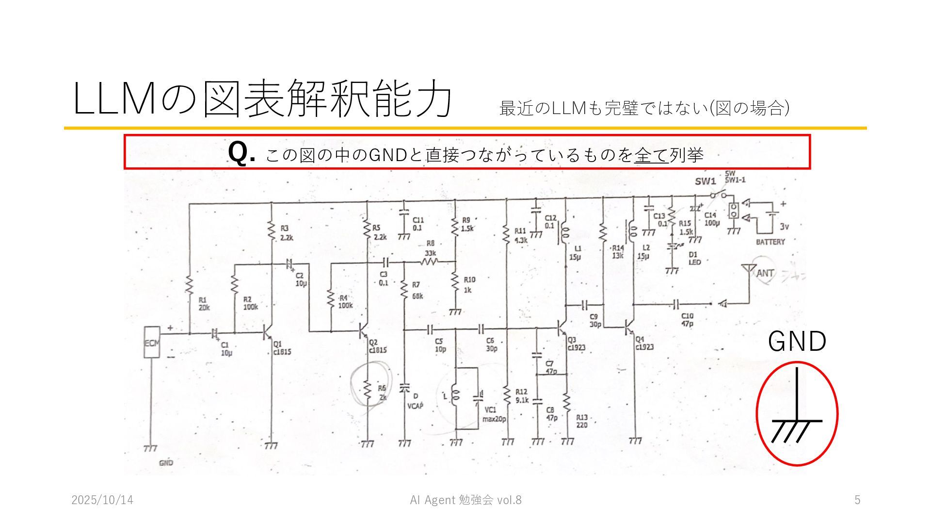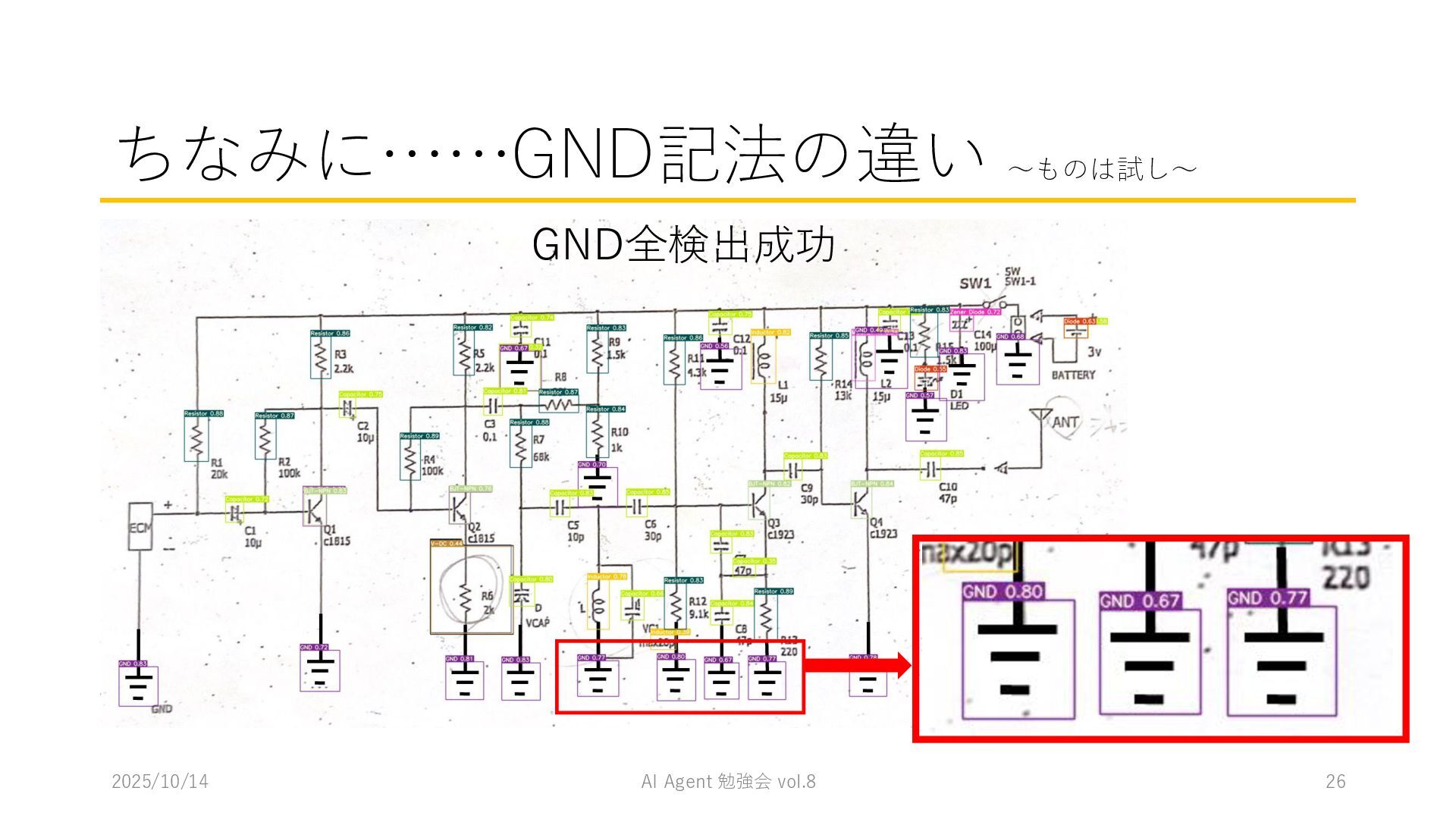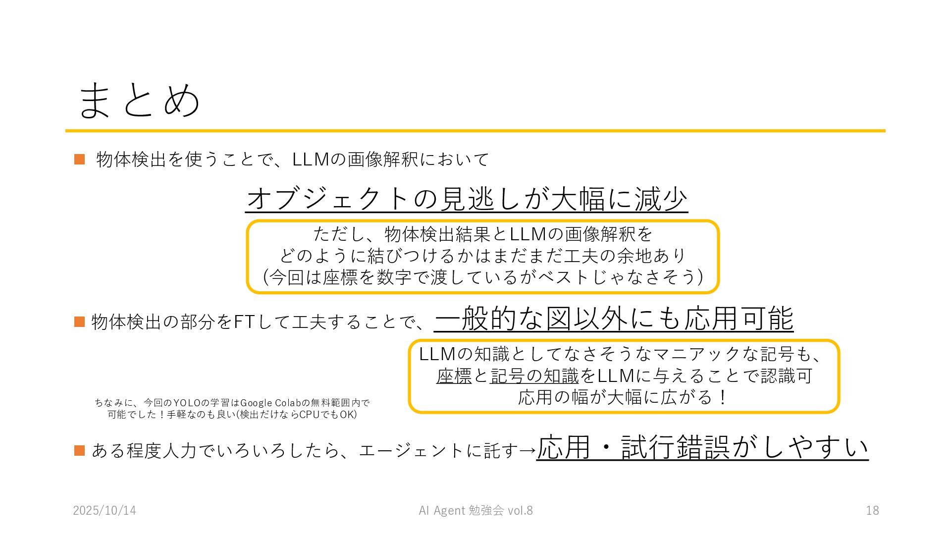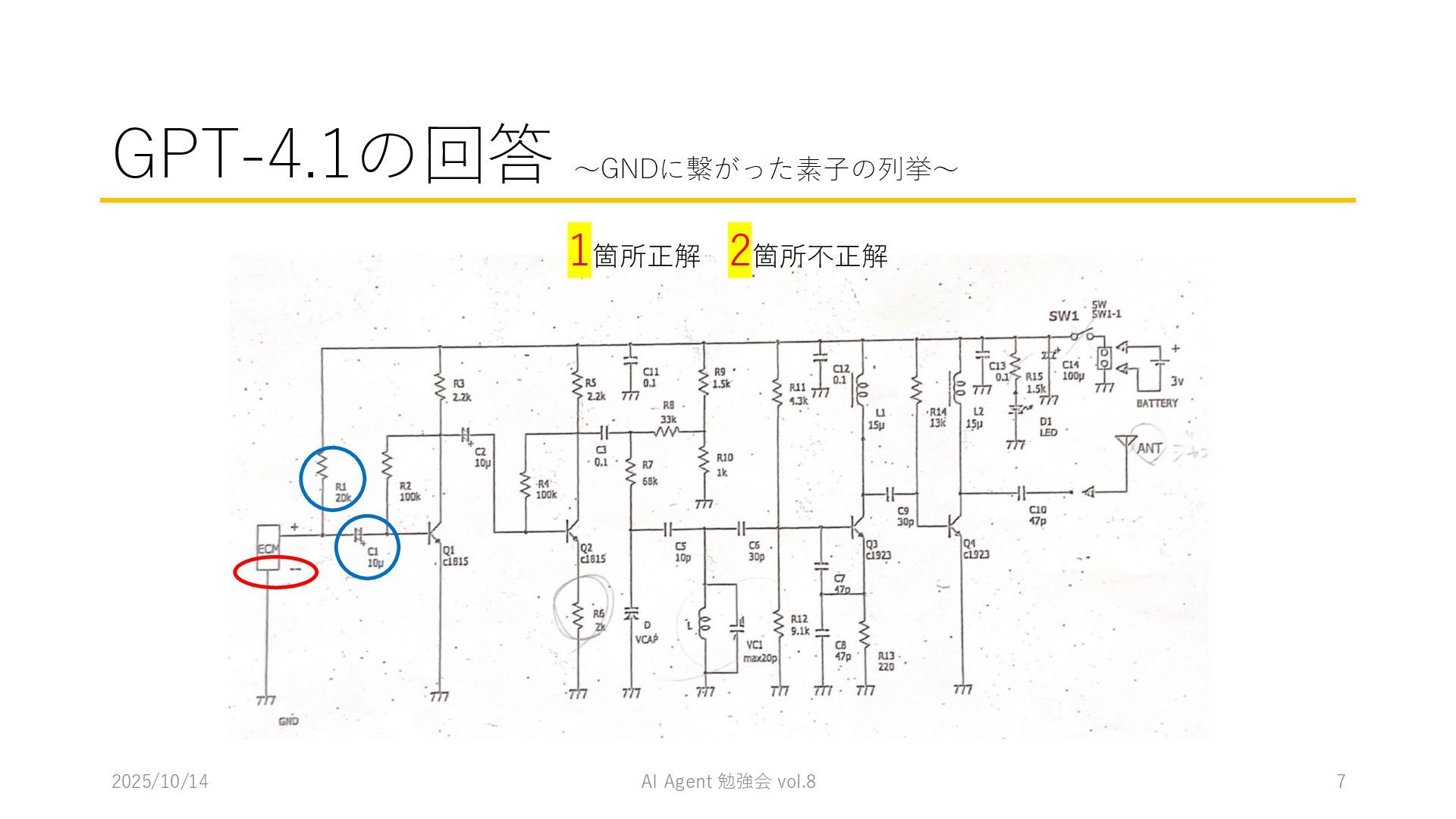 15 必要に応じて、以下の情報を用いてください。これらの情報を活用して、問題の最終的な答えを出してく ださい。 1. コンテナ内に、画像を物体検出した結果があります。(画像と、labels/には検出結果のテキストファ イルがあります。) 検出結果のテキストファイルは、「検出オブジェクトのラベルID,馬雲ディグボックスの左上のx座標,y座 標,バウンディングボックスの横幅,高さ」の形になっています。 2. オブジェクトのラベルIDは、以下のリストのインデックス(0始まり)になっています。 [ 'BJT-NPN', 'BJT-PNP', 'Capacitor', 'Diode', 'GND', 'I-AC', 'I-DC', 'Inductor', 'MOSFET-N', 'MOSFET-P', 'Op-Amp', 'Resistor', 'V-AC', 'V-DC', 'V-DC (one port)', 'Wire Crossover', 'Zener Diode' ] 問題を説明したプロンプトに、以下を追加してからAgent実行 1. 検出結果のディレクトリを圧縮して、Containers APIを用いて作成されたコンテナに格納 2. Response APIを呼び出す(一応Code Interpreterにしておいた) ※結果は前述の取り組みの結果と大差なく、 モデルによって性能が大きく揺れる印象