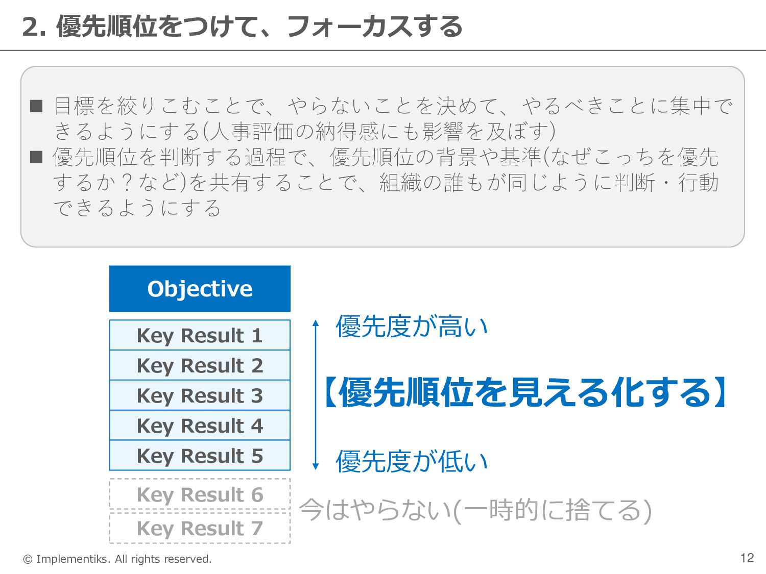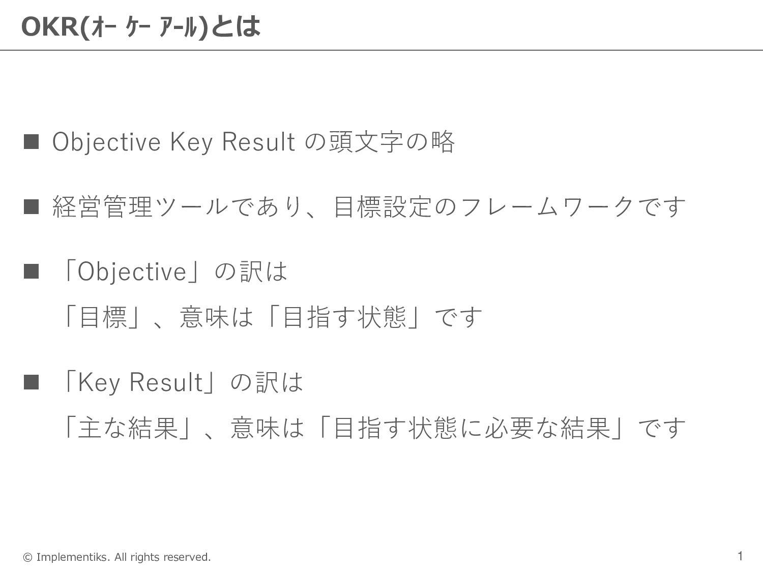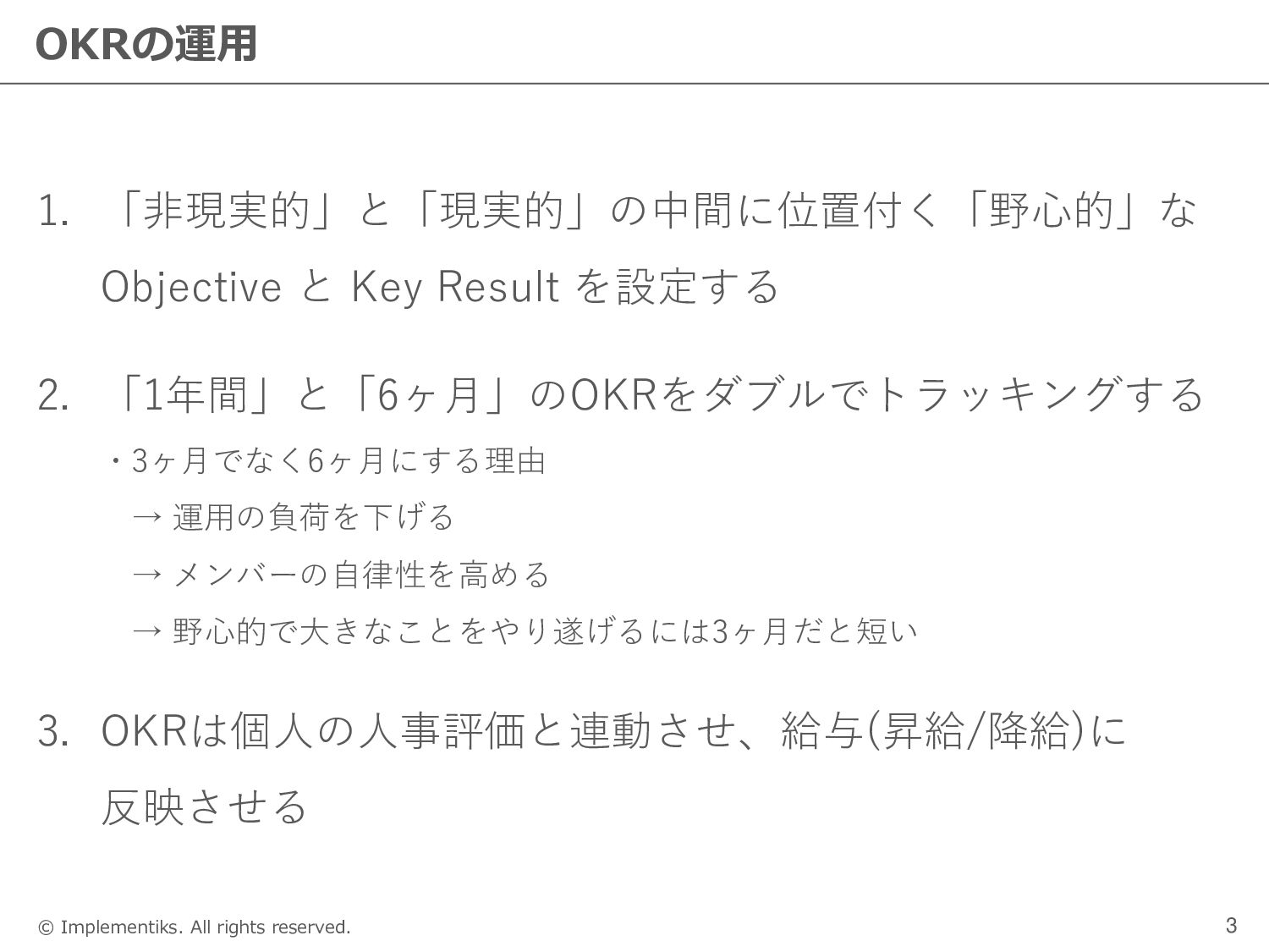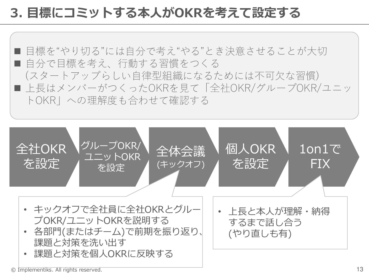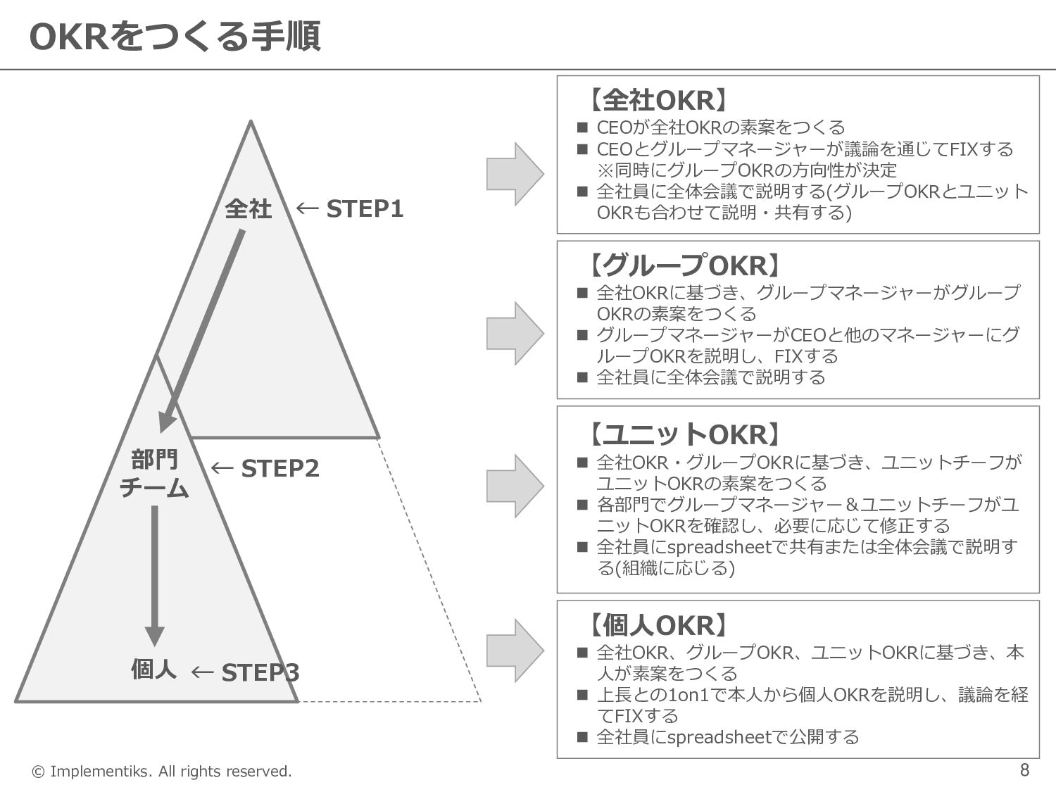 個人 ← STEP1 ← STEP2 ← STEP3 【全社OKR】 ◼ CEOが全社OKRの素案をつくる ◼ CEOとグループマネージャーが議論を通じてFIXする ※同時にグループOKRの方向性が決定 ◼ 全社員に全体会議で説明する(グループOKRとユニット OKRも合わせて説明・共有する) 【グループOKR】 ◼ 全社OKRに基づき、グループマネージャーがグループ OKRの素案をつくる ◼ グループマネージャーがCEOと他のマネージャーにグ ループOKRを説明し、FIXする ◼ 全社員に全体会議で説明する 【個人OKR】 ◼ 全社OKR、グループOKR、ユニットOKRに基づき、本 人が素案をつくる ◼ 上長との1on1で本人から個人OKRを説明し、議論を経 てFIXする ◼ 全社員にspreadsheetで公開する 【ユニットOKR】 ◼ 全社OKR・グループOKRに基づき、ユニットチーフが ユニットOKRの素案をつくる ◼ 各部門でグループマネージャー&ユニットチーフがユ ニットOKRを確認し、必要に応じて修正する ◼ 全社員にspreadsheetで共有または全体会議で説明す る(組織に応じる)
