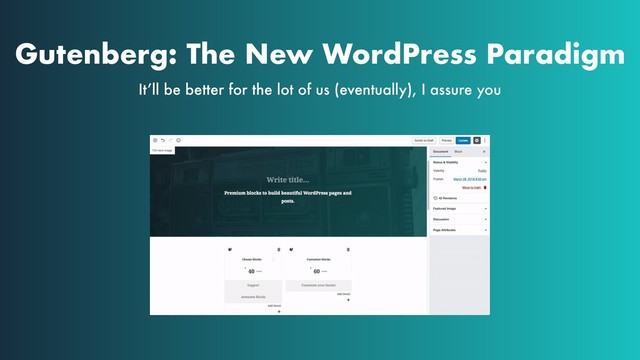 The new visual editor sure does inspire consternation in the WordPress community. As with any disruption, there will be winners and losers in professional world – but what about the end-user? Can the new editor make life easier for them? And for professionals, how will Gutenberg change theme development? What about page-builders – things of the past? Instead of focusing on launch and transition issues, I’ll describe how we think the fundamentals of the WordPress experience will change (for the better) for both the end-user AND the professional.