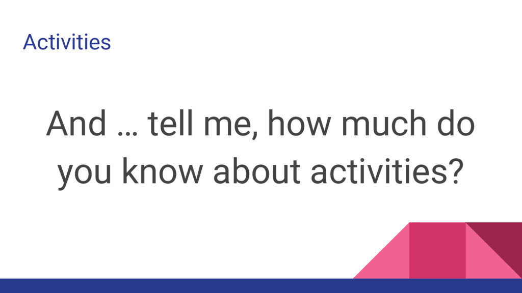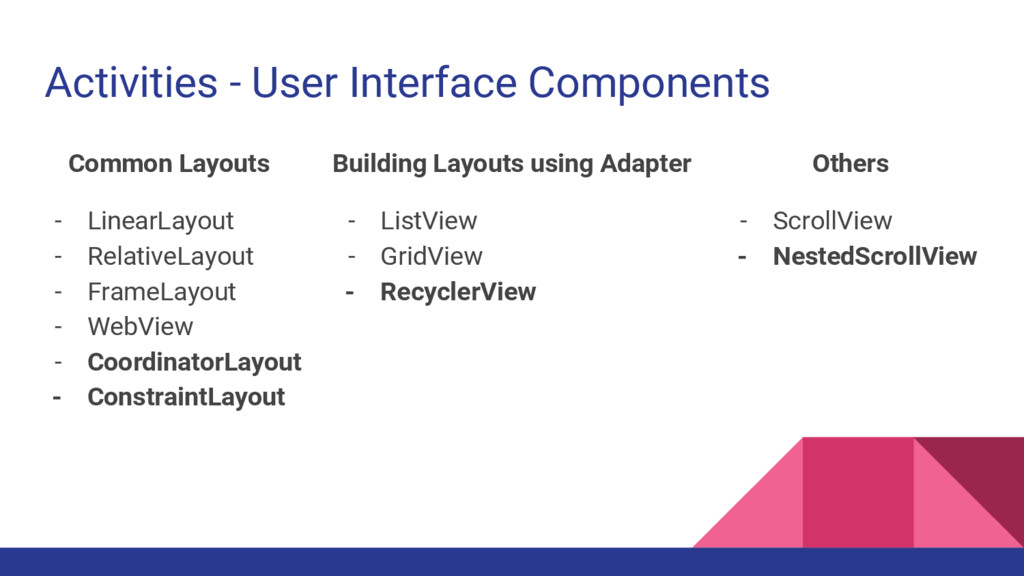Java isn’t Android. • Respect android conventions. • Every attributes of an Android Component must have the letter “m” as a prefix. • Every static final constants must be in capital letter using “_” between words. • Be careful when you are going to use the Application Context or your Activity as a Context. • Google is your friend, read the docs! • Try to use fragments and use Activity as a container for them. Sometimes it’s difficult, but is the correct way. • Research, research, research and research :)