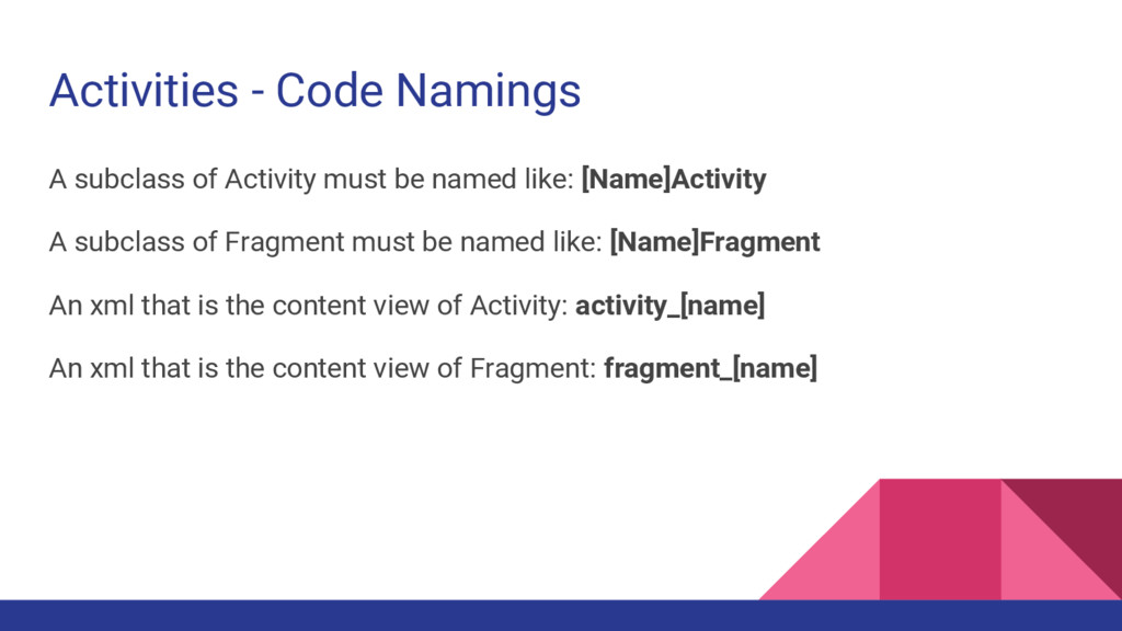 named like: [Name]Activity A subclass of Fragment must be named like: [Name]Fragment An xml that is the content view of Activity: activity_[name] An xml that is the content view of Fragment: fragment_[name]