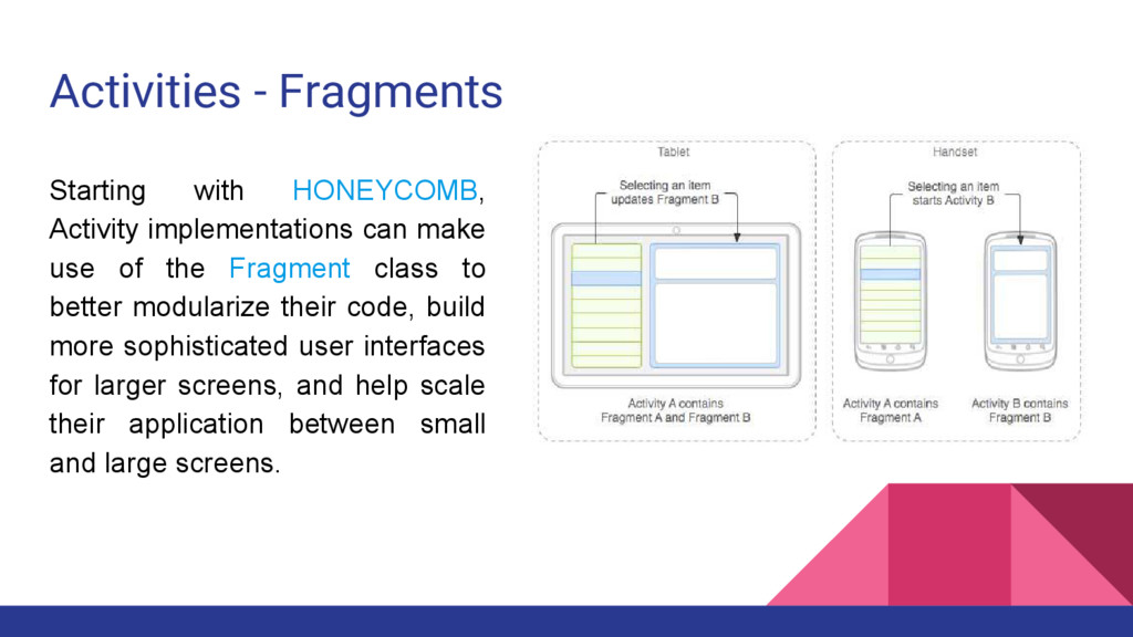 use of the Fragment class to better modularize their code, build more sophisticated user interfaces for larger screens, and help scale their application between small and large screens.