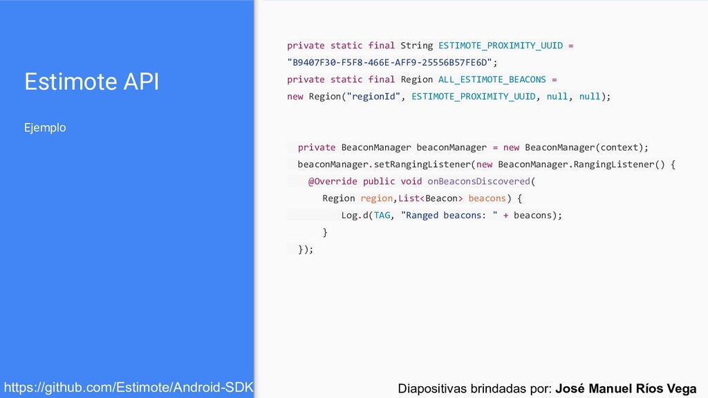 { try { beaconManager.startRanging(ALL_ESTIMOTE_BEACONS); } catch (RemoteException e) { Log.e(TAG, "Cannot start ranging", e); } } }); // #onStop. try { beaconManager.stopRanging(ALL_ESTIMOTE_BEACONS); } catch (RemoteException e) { Log.e(TAG, "Cannot stop but it does not matter now", e); } // #onDestroy. beaconManager.disconnect(); https://github.com/Estimote/Android-SDK Diapositivas brindadas por: José Manuel Ríos Vega