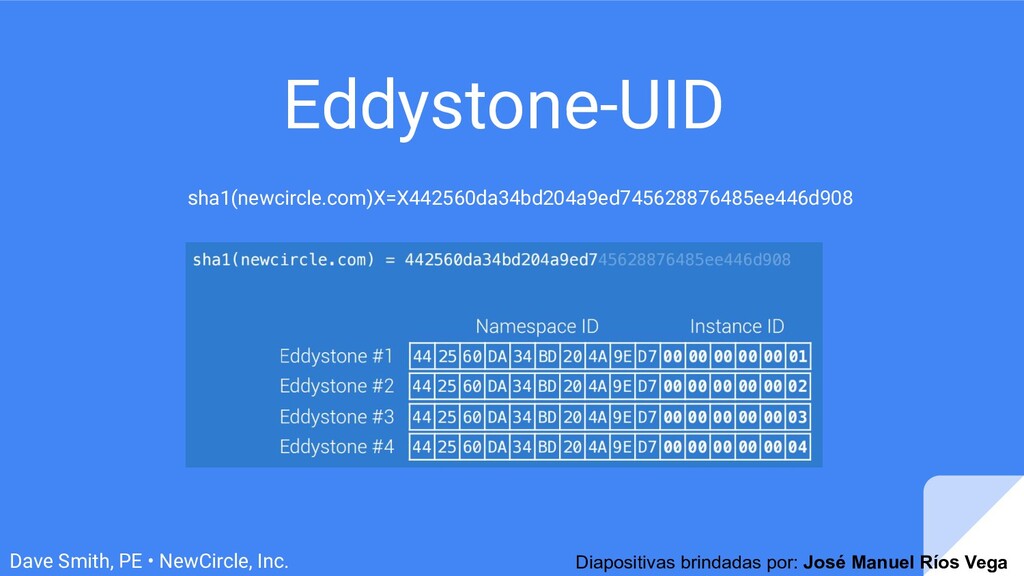 Eddystone-UID sha1(newcircle.com)X=X442560da34bd204a9ed745628876485ee446d908 Dave Smith, PE • NewCircle, Inc. Diapositivas brindadas