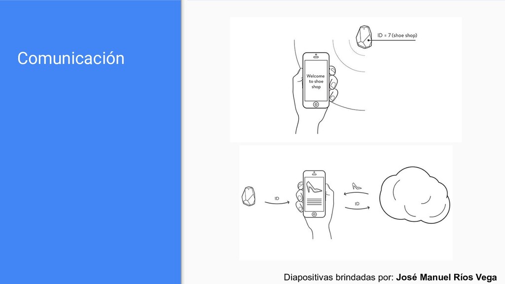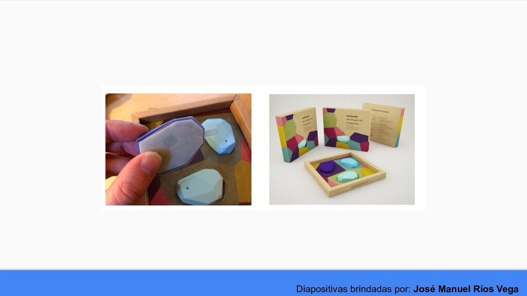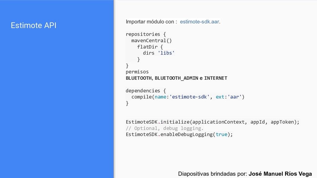 flatDir { dirs 'libs' } } permisos BLUETOOTH, BLUETOOTH_ADMIN e INTERNET dependencies { compile(name:'estimote-sdk', ext:'aar') } EstimoteSDK.initialize(applicationContext, appId, appToken); // Optional, debug logging. EstimoteSDK.enableDebugLogging(true); Diapositivas brindadas por: José Manuel Ríos Vega
