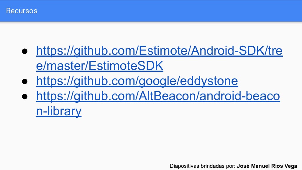 Recursos • https://github.com/Estimote/Android-SDK/tre e/master/EstimoteSDK • https://github.com/google/eddystone • https://github.com/AltBeacon/android-beaco n-library Diapositivas