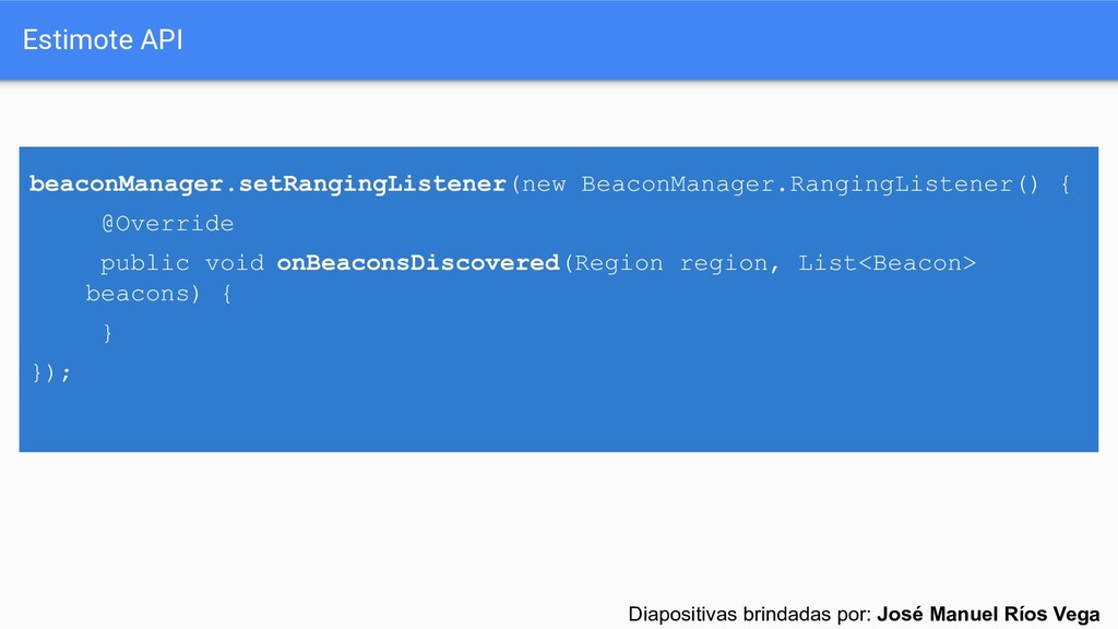 List<Beacon> beacons) { } }); Diapositivas brindadas por: José Manuel Ríos Vega