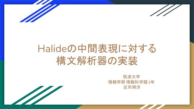 2019/9/9から2019/9/27までの間、株式会社Fixstarsさんのサマーインターンに「画像処理DSL(Halide)のFPGA向け最適化コンパイラの開発」というテーマで参加しました。そこで、Halideの中間表現に対する構文解析器を実装しました。これは、そのサマーインターンの成果報告会のために作ったもので、外部に一般公開して良いとの許可を快くいただけたので、公開したものです。
