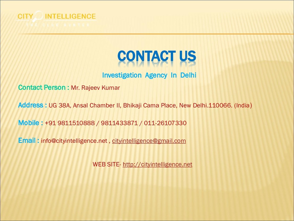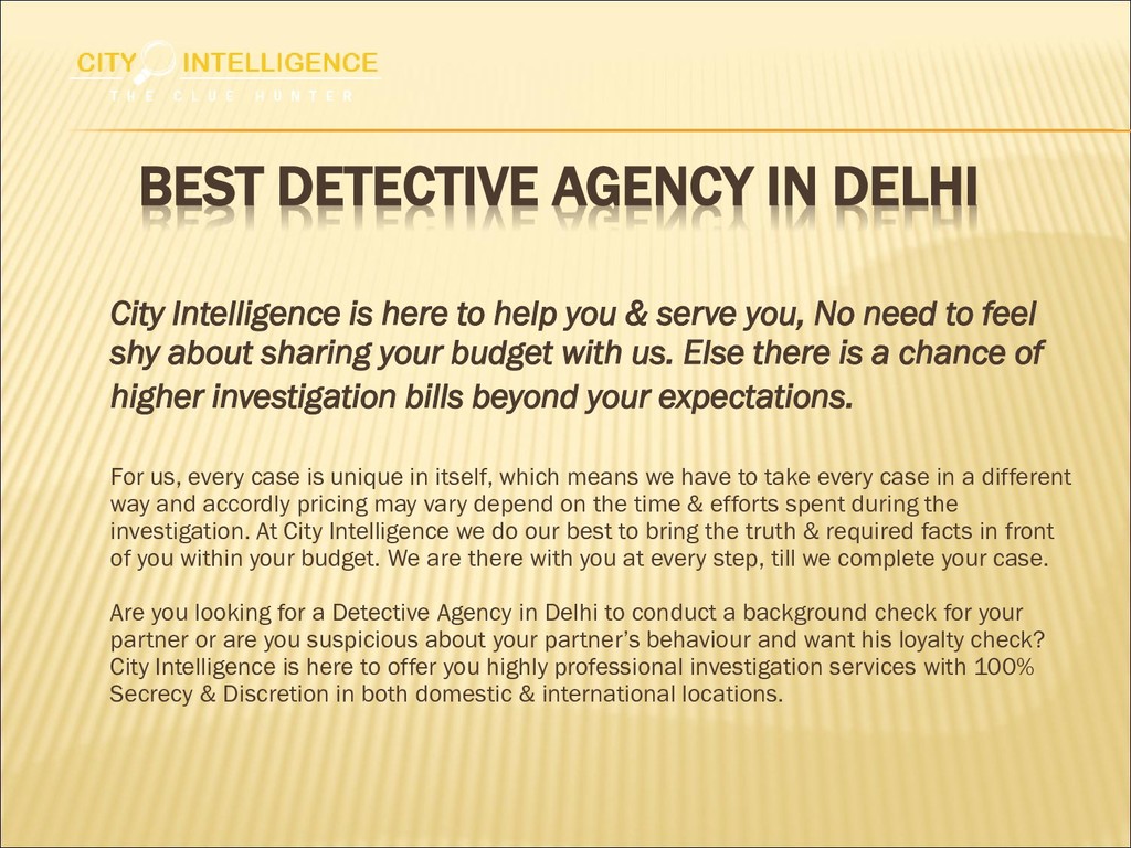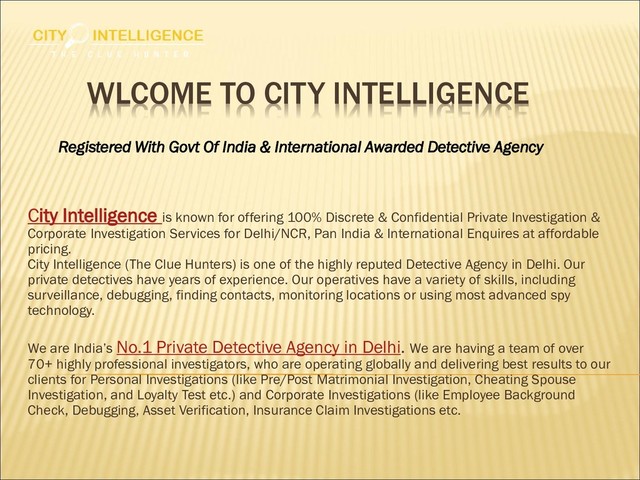 City Intelligence is professional Private Detective Agency In Delhi, Delhi-NCR. City Intelligence Agency is particularly popular because of its high-class service and client reliability. We serve in personal detectives in Delhi and corporate detective in Delhi both. We are in detective field from past one decade.for more info visit this site.. http://www.cityintelligence.net