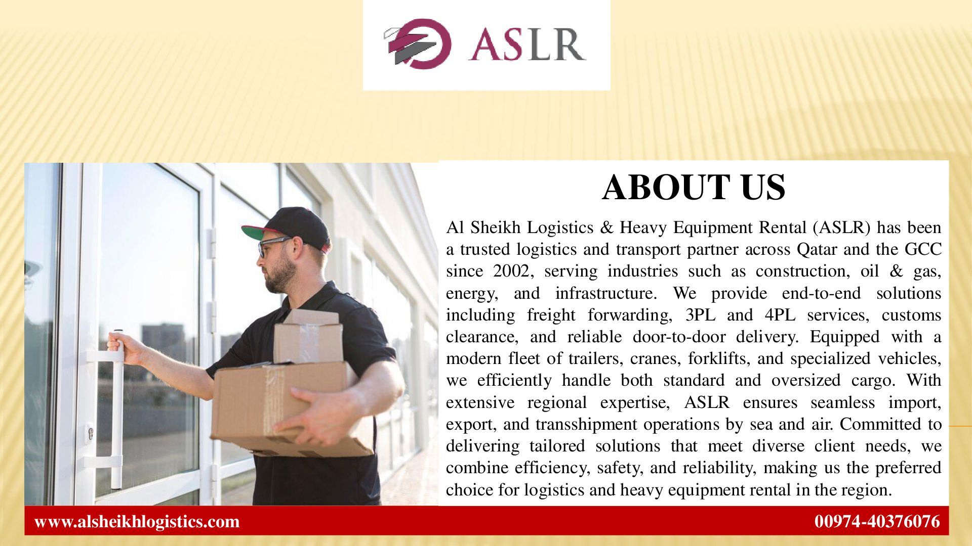 has been a trusted logistics and transport partner across Qatar and the GCC since 2002, serving industries such as construction, oil & gas, energy, and infrastructure. We provide end-to-end solutions including freight forwarding, 3PL and 4PL services, customs clearance, and reliable door-to-door delivery. Equipped with a modern fleet of trailers, cranes, forklifts, and specialized vehicles, we efficiently handle both standard and oversized cargo. With extensive regional expertise, ASLR ensures seamless import, export, and transshipment operations by sea and air. Committed to delivering tailored solutions that meet diverse client needs, we combine efficiency, safety, and reliability, making us the preferred choice for logistics and heavy equipment rental in the region. ABOUT US