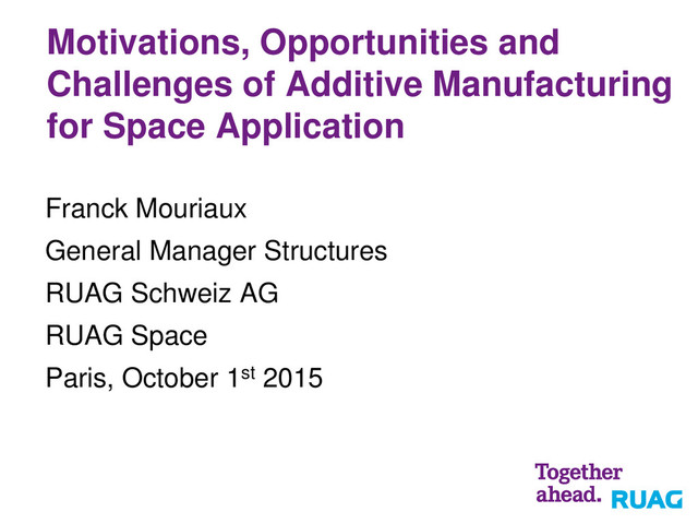 Additive manufacturing (AM) technologies have progressed rapidly in the last years. Supported by the recent developments of design optimisation tools and manufacturing capabilities, components and parts produced using AM are emerging more and more into the focus of space industry. The aim of this presentation is to show why AM can be seen a promising manufacturing technique for space industry and in particular for satellite application? Opportunities and challenges that have to be faced to make 3D printed components “flying” on spacecraft are presented and discussed. The re-engineering and qualification approach of the already existing Antenna Support Bracket, that is part of the Sentinel-1 spacecraft, is discussed as a case study to bring this topic into the more tangible context of an industrial project.