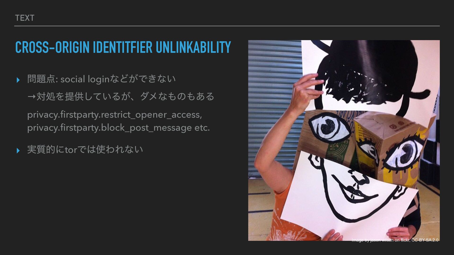 privacy. fi rstparty.restrict_opener_access, privacy. fi rstparty.block_post_message etc. ▸ ࣮࣭తʹtorͰΘΕͳ͍ Image by jason wilson on flickr, CC-BY-SA 2.0
