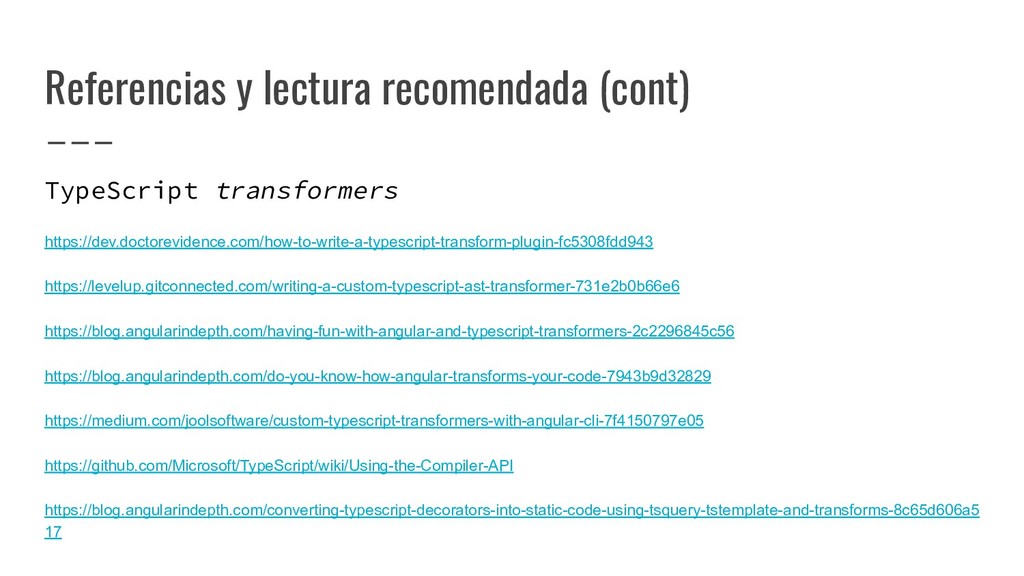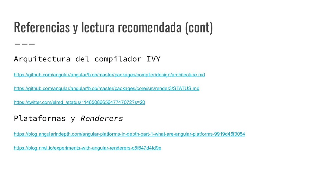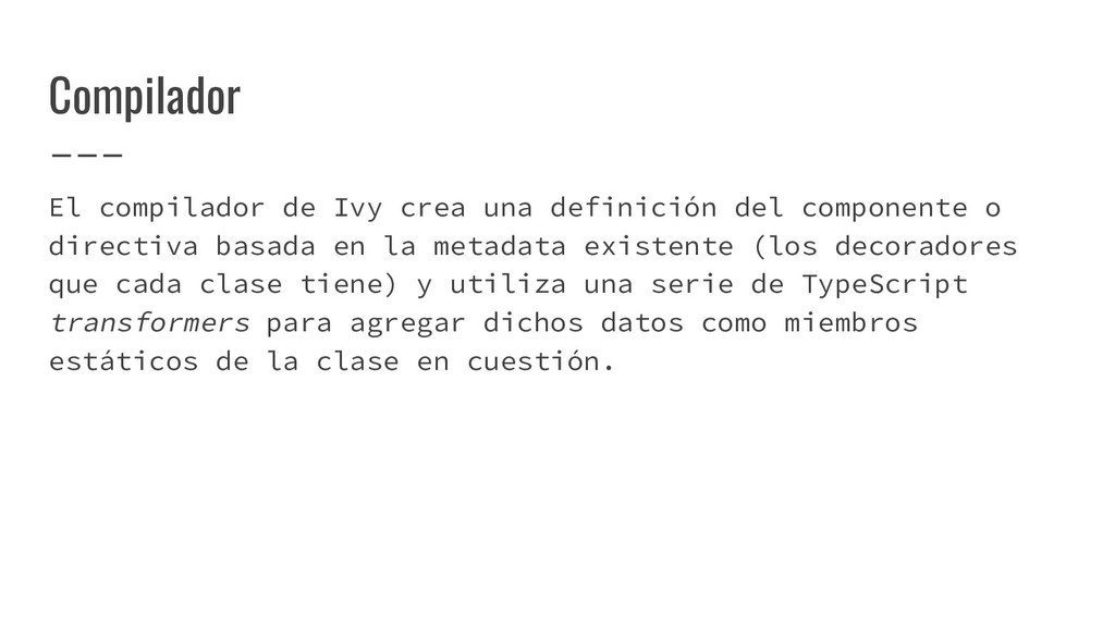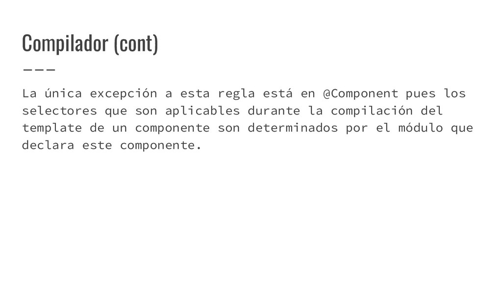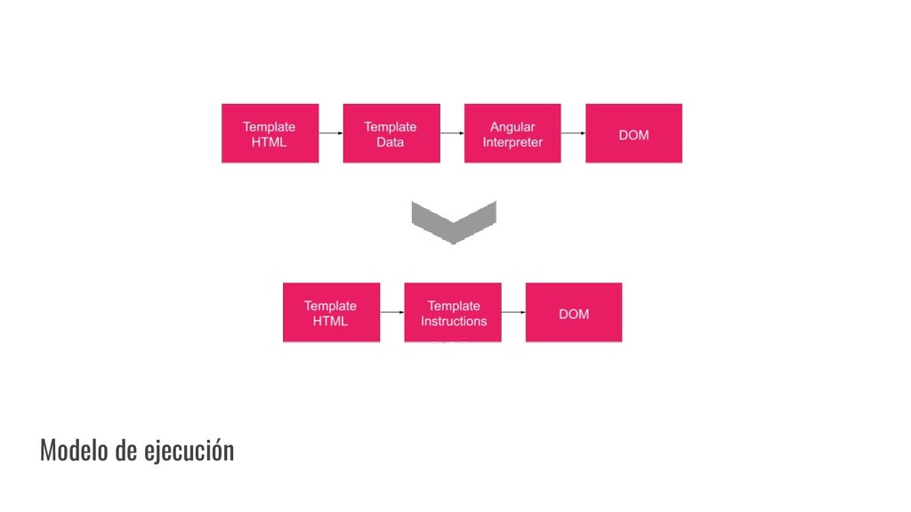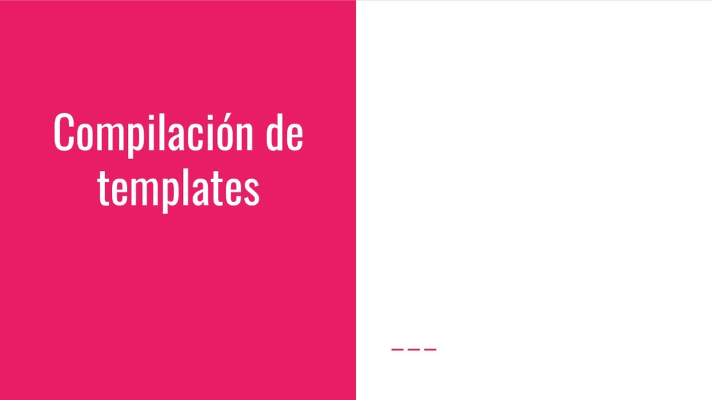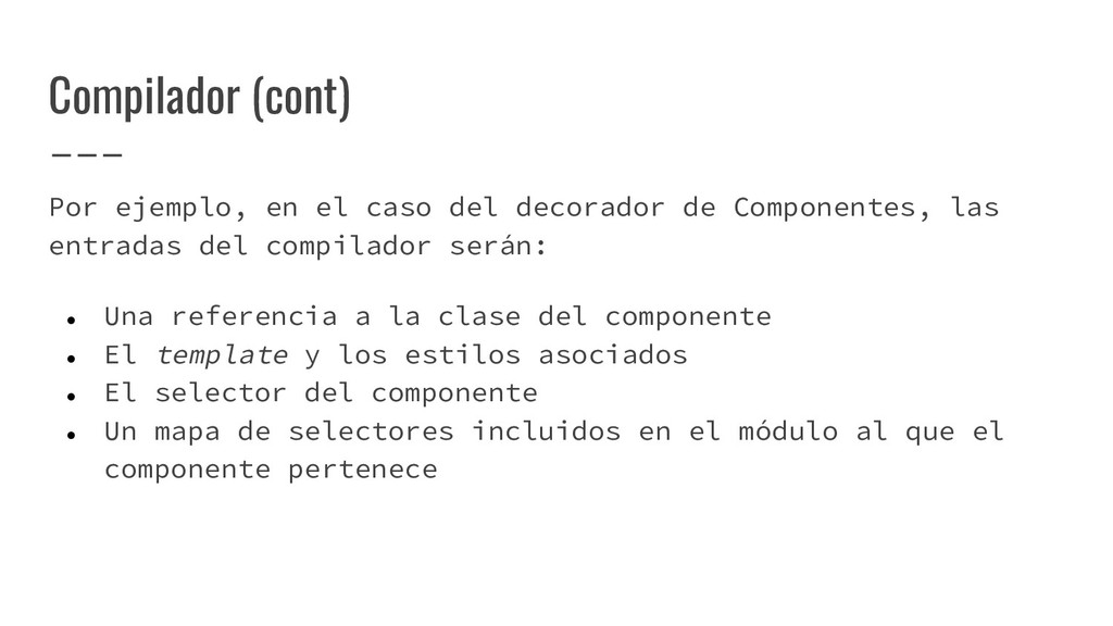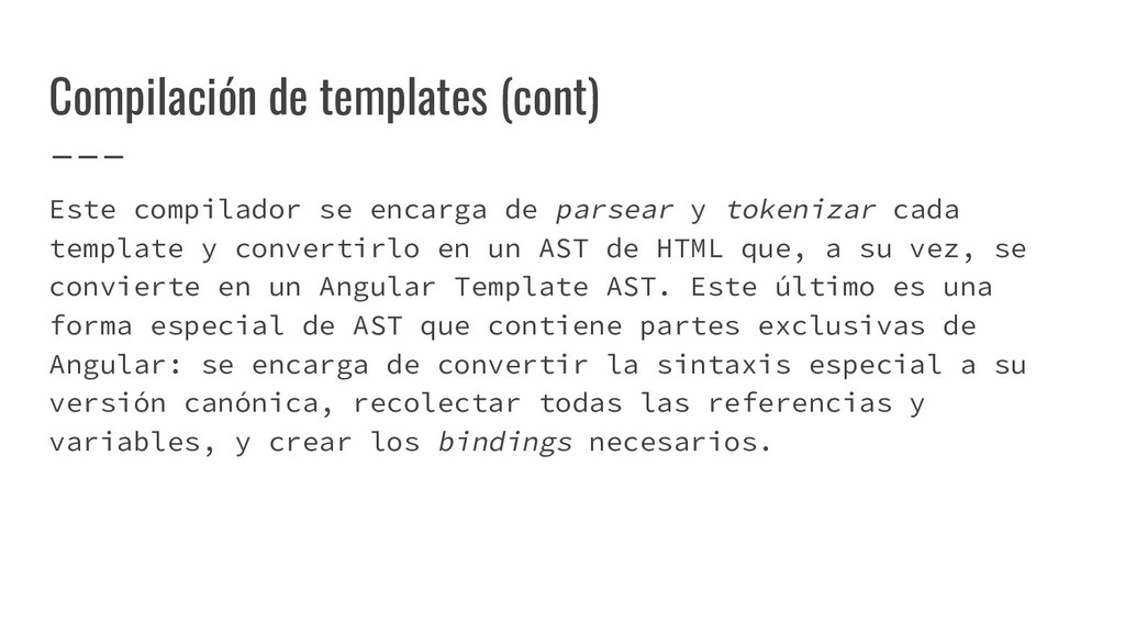 y convertirlo en un AST de HTML que, a su vez, se convierte en un Angular Template AST. Este último es una forma especial de AST que contiene partes exclusivas de Angular: se encarga de convertir la sintaxis especial a su versión canónica, recolectar todas las referencias y variables, y crear los bindings necesarios. Compilación de templates (cont)