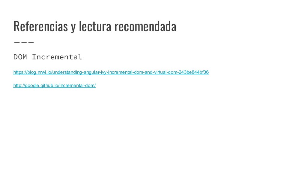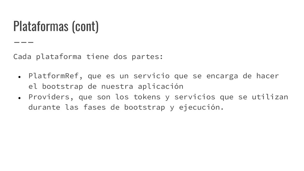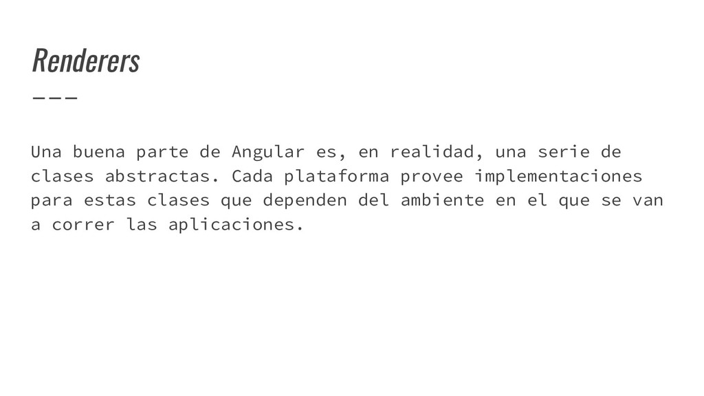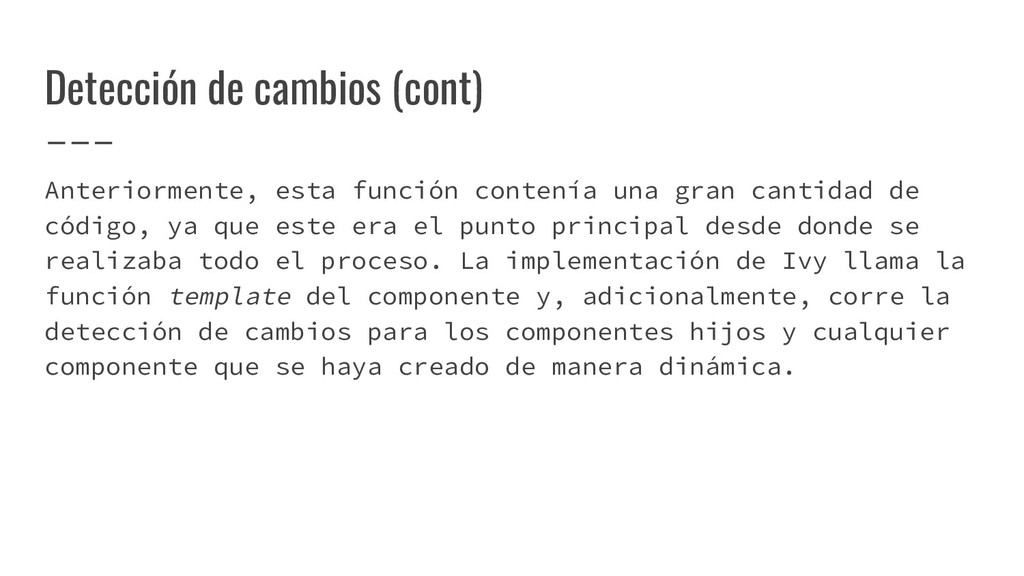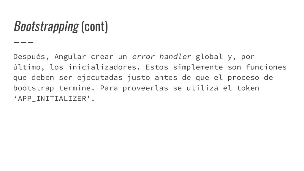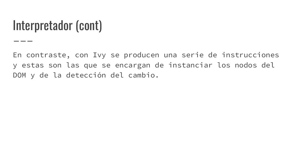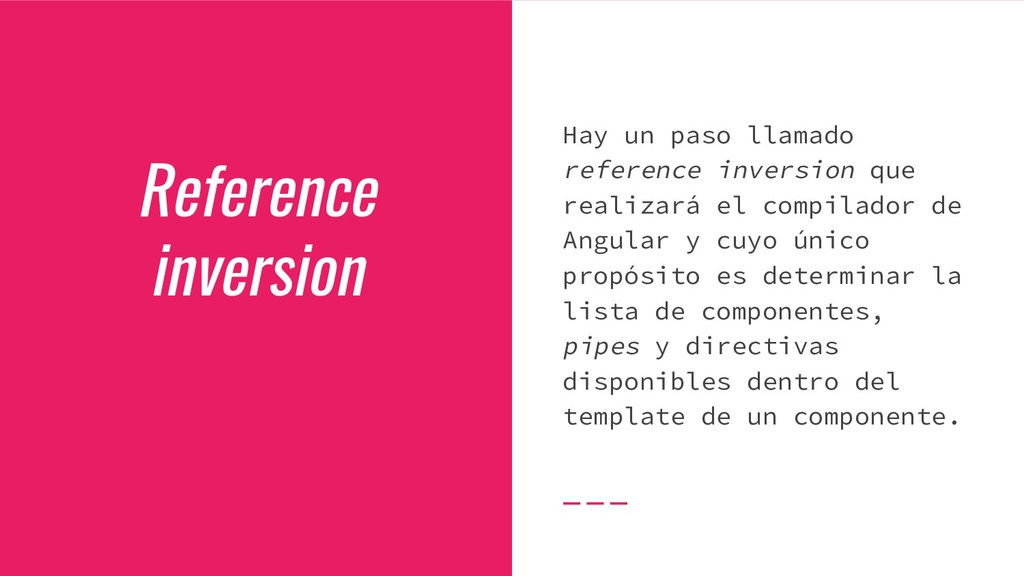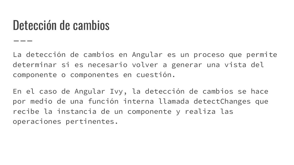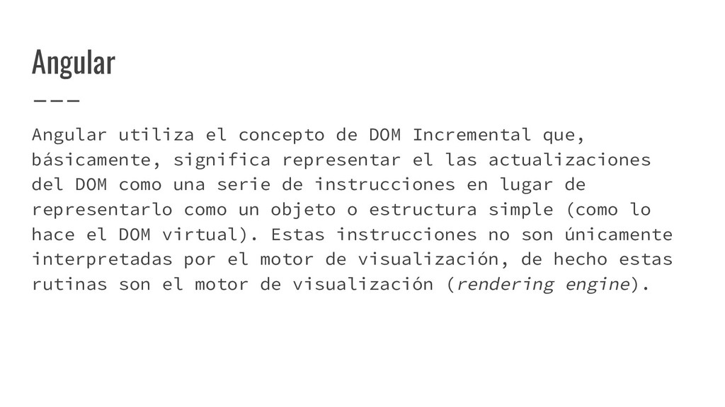 y convertirlo en un AST de HTML que, a su vez, se convierte en un Angular Template AST. Este último es una forma especial de AST que contiene partes exclusivas de Angular: se encarga de convertir la sintaxis especial a su versión canónica, recolectar todas las referencias y variables, y crear los bindings necesarios. Compilación de templates (cont)